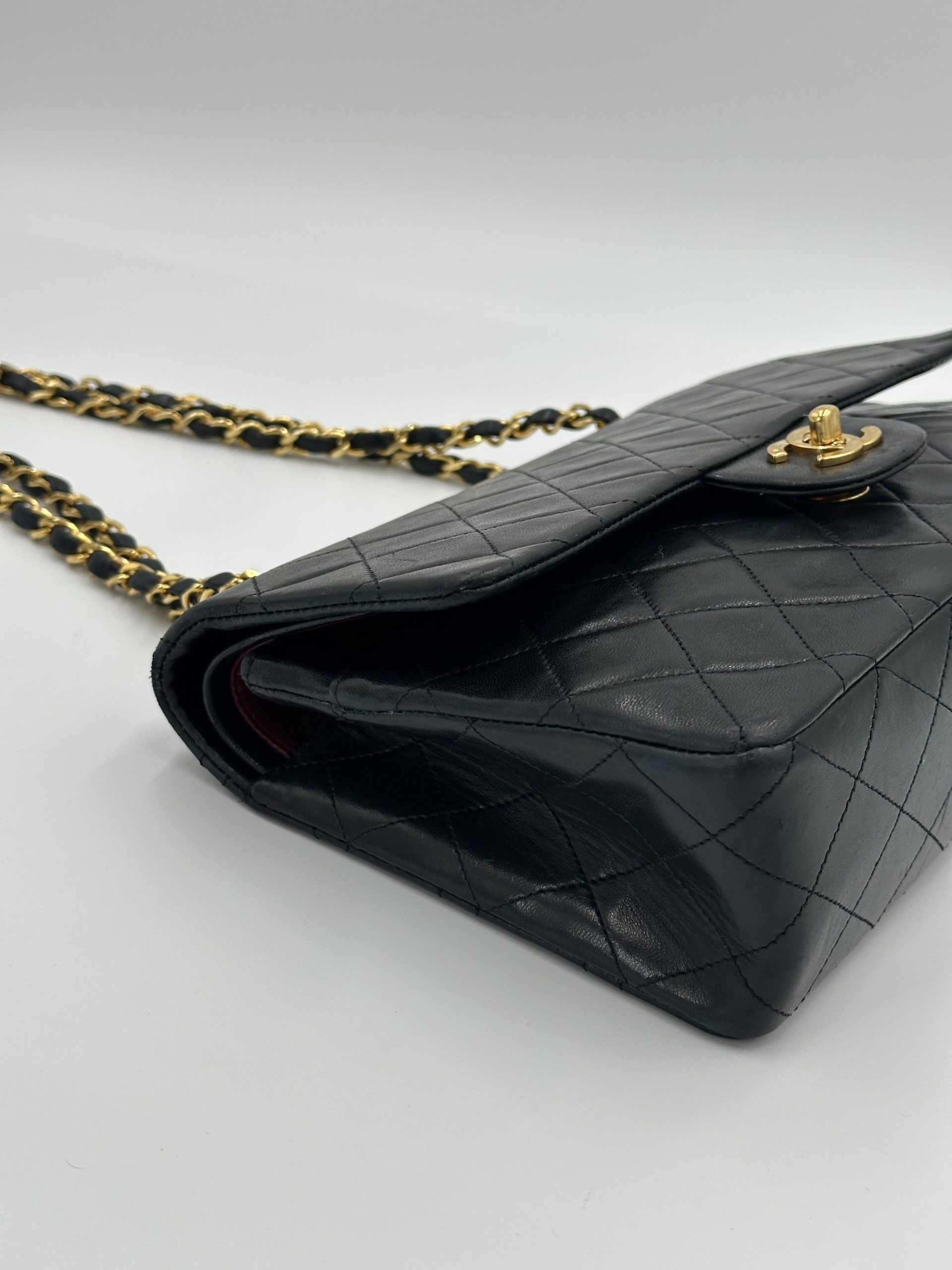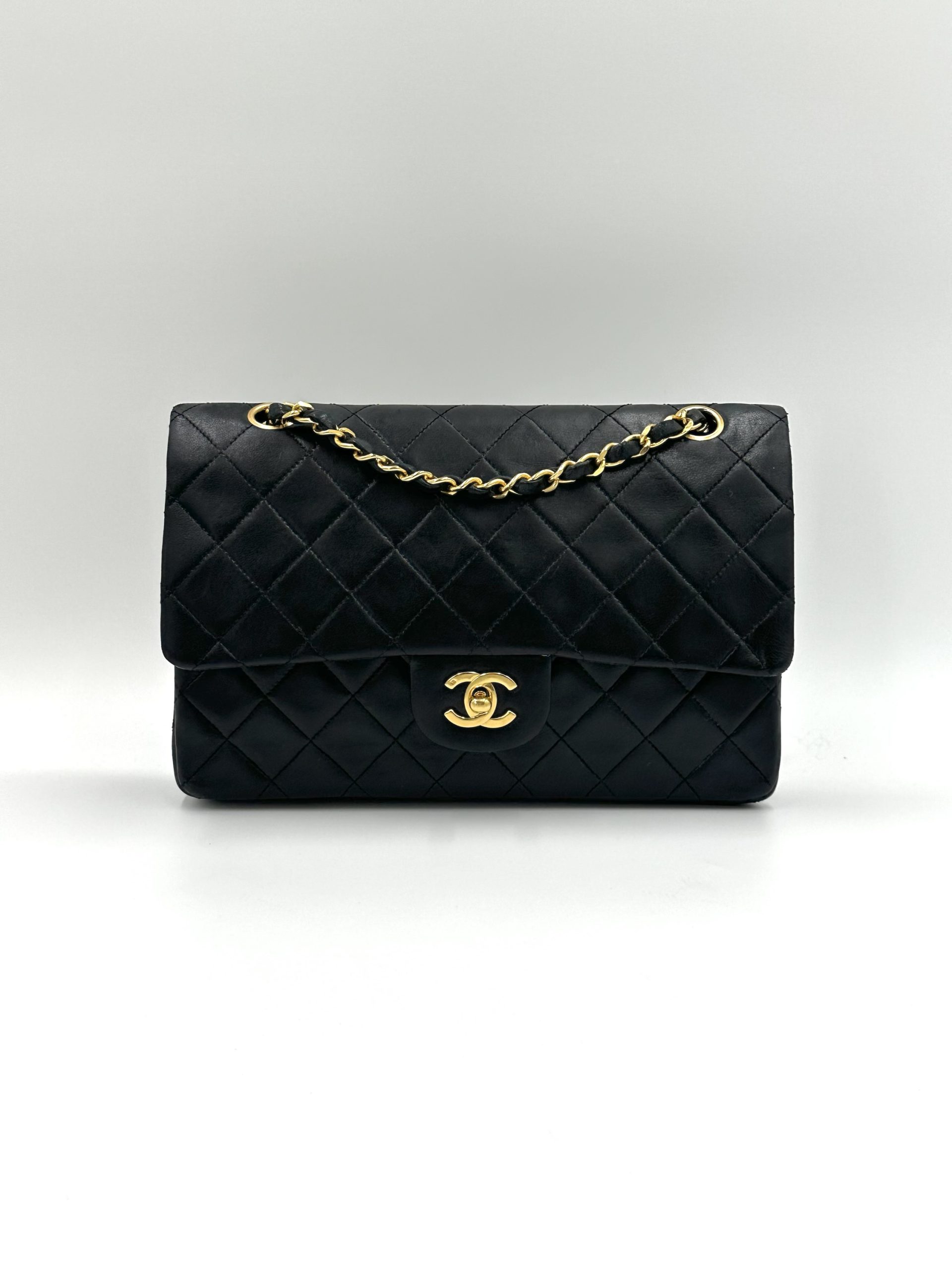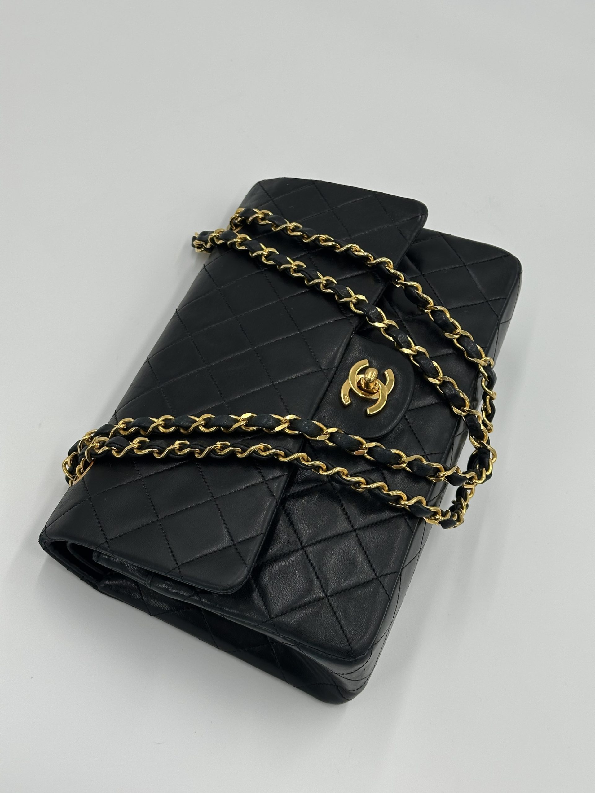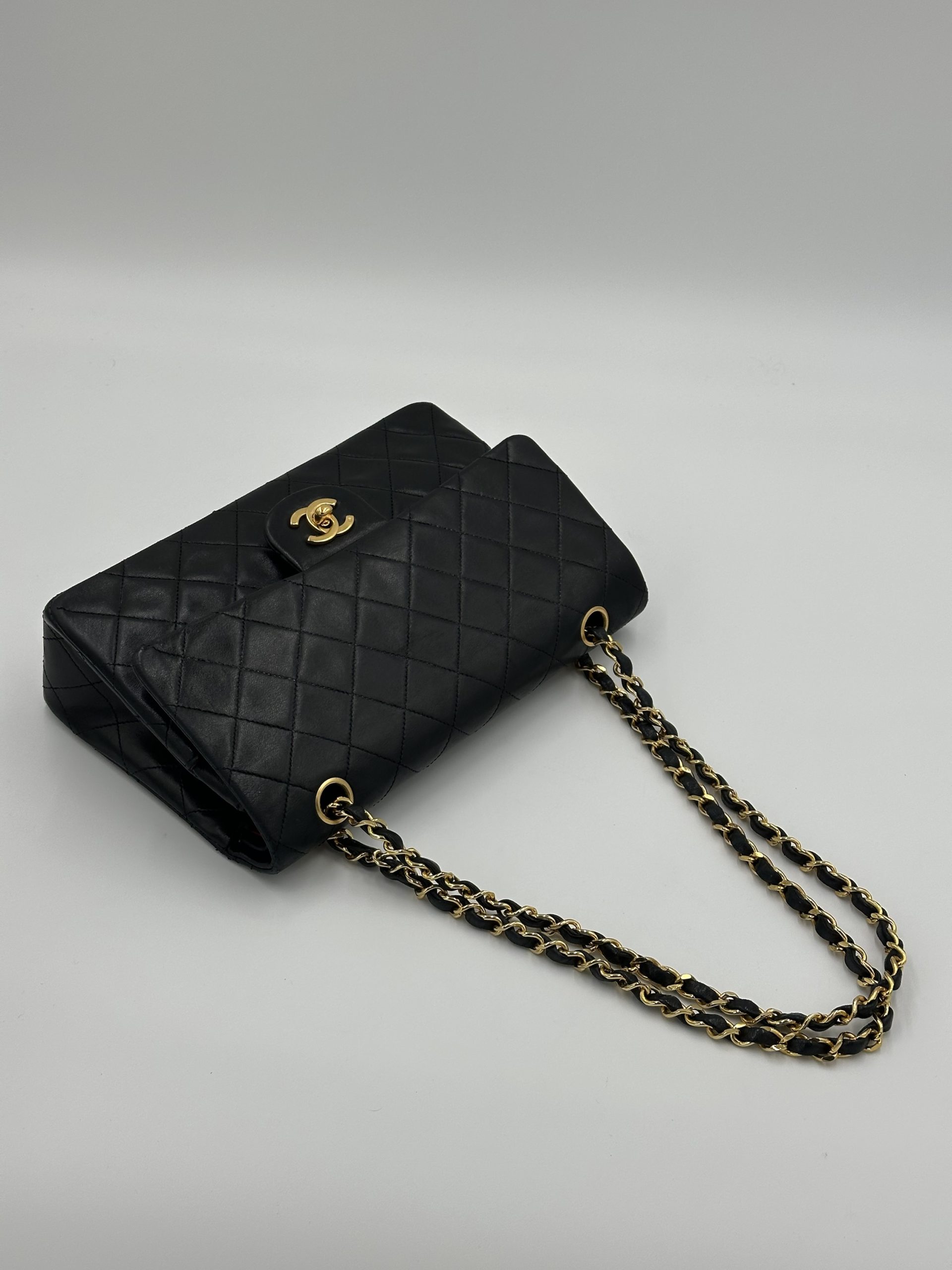 En tidløs Chanel Classic medium double Flap Bag i sort lammeskind med ikonisk quiltet mønster og 24K forgyldt hardware. Denne vintage skat kombinerer sofistikeret elegance med klassisk parisisk chic — et statement piece, der aldrig går af mode.