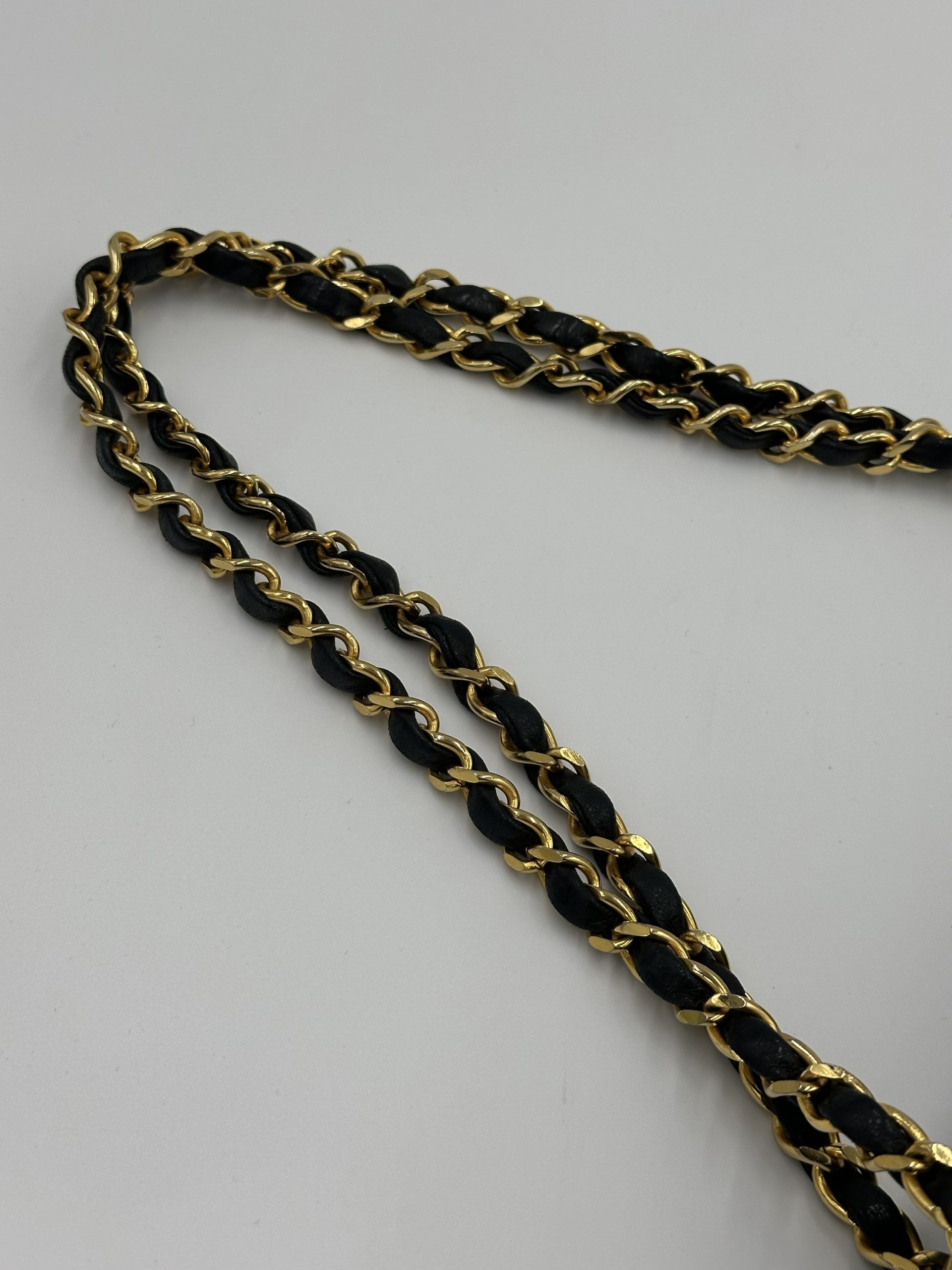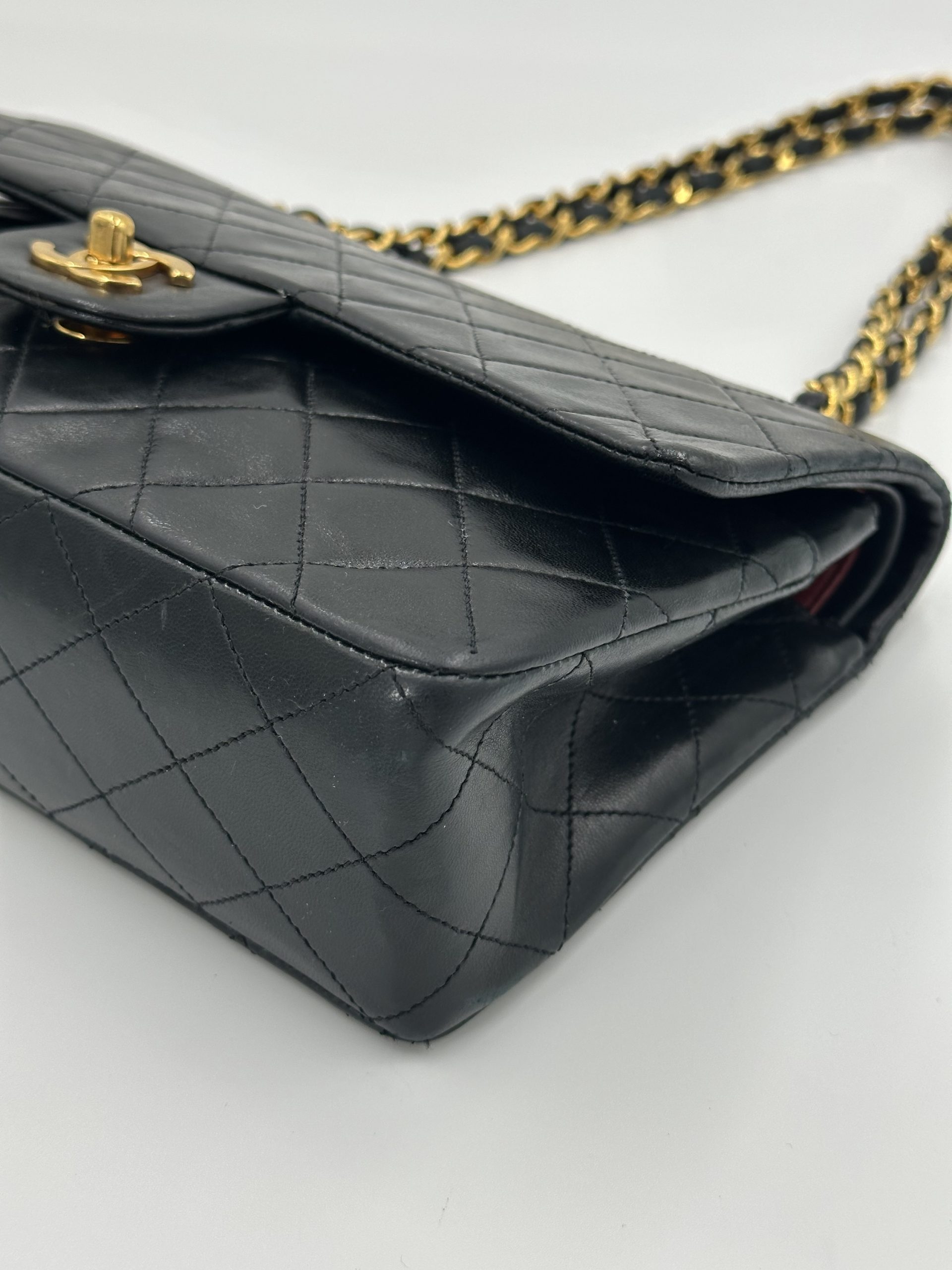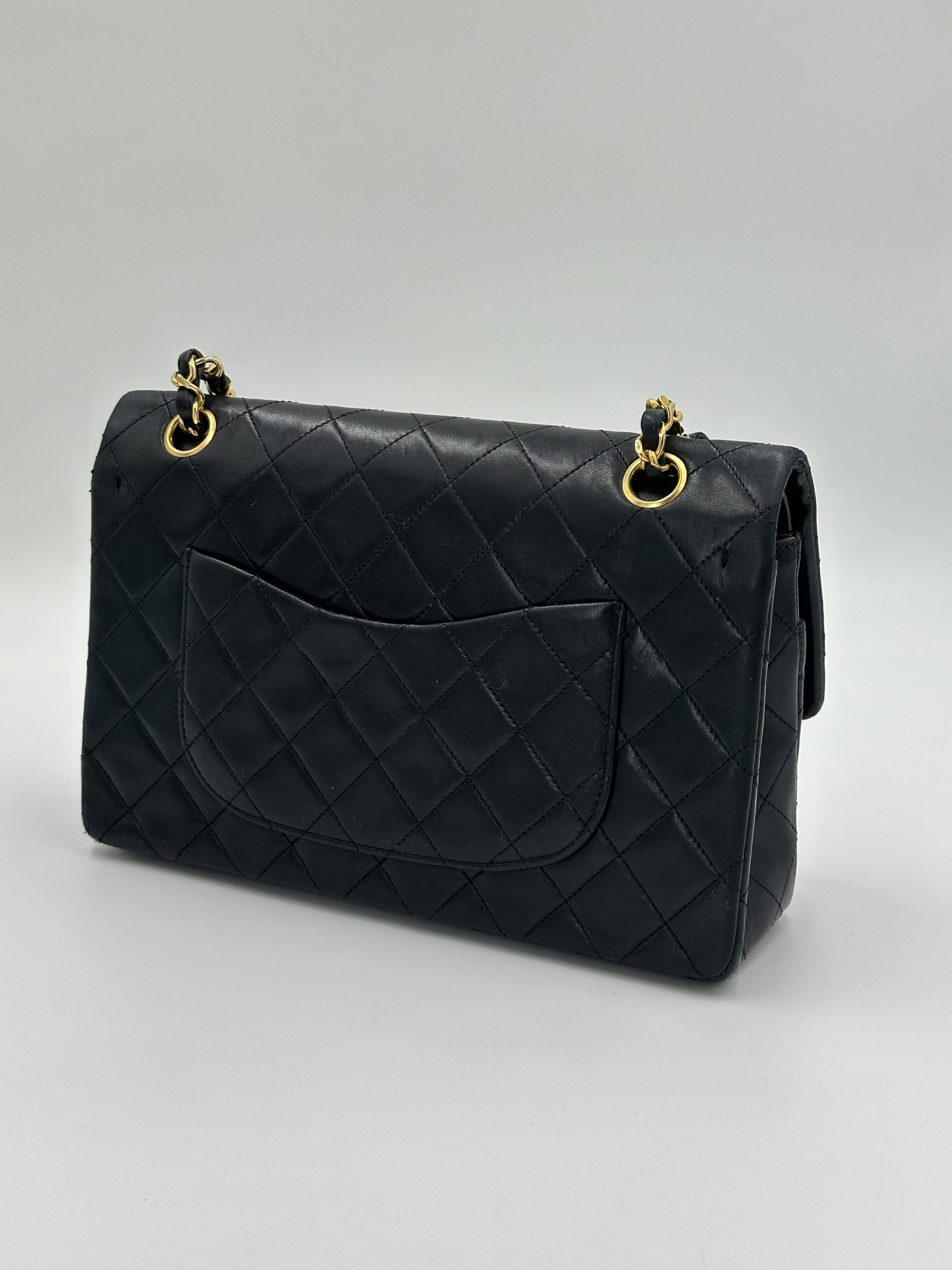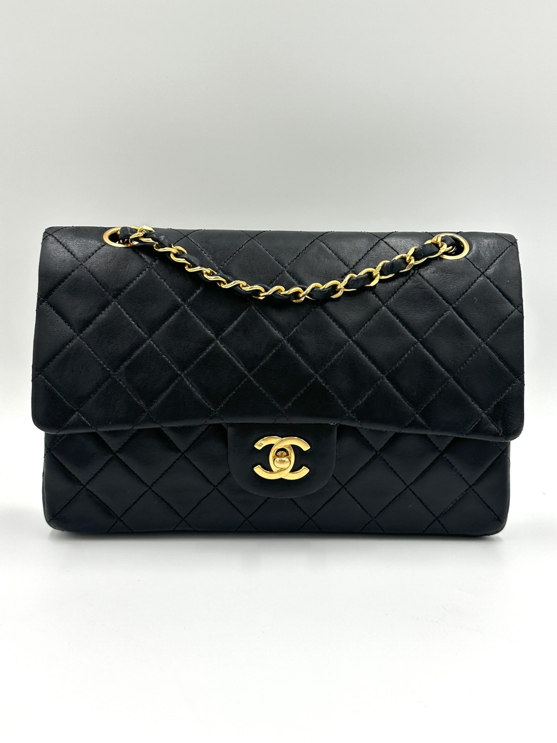 En tidløs Chanel Classic medium double Flap Bag i sort lammeskind med ikonisk quiltet mønster og 24K forgyldt hardware. Denne vintage skat kombinerer sofistikeret elegance med klassisk parisisk chic — et statement piece, der aldrig går af mode.