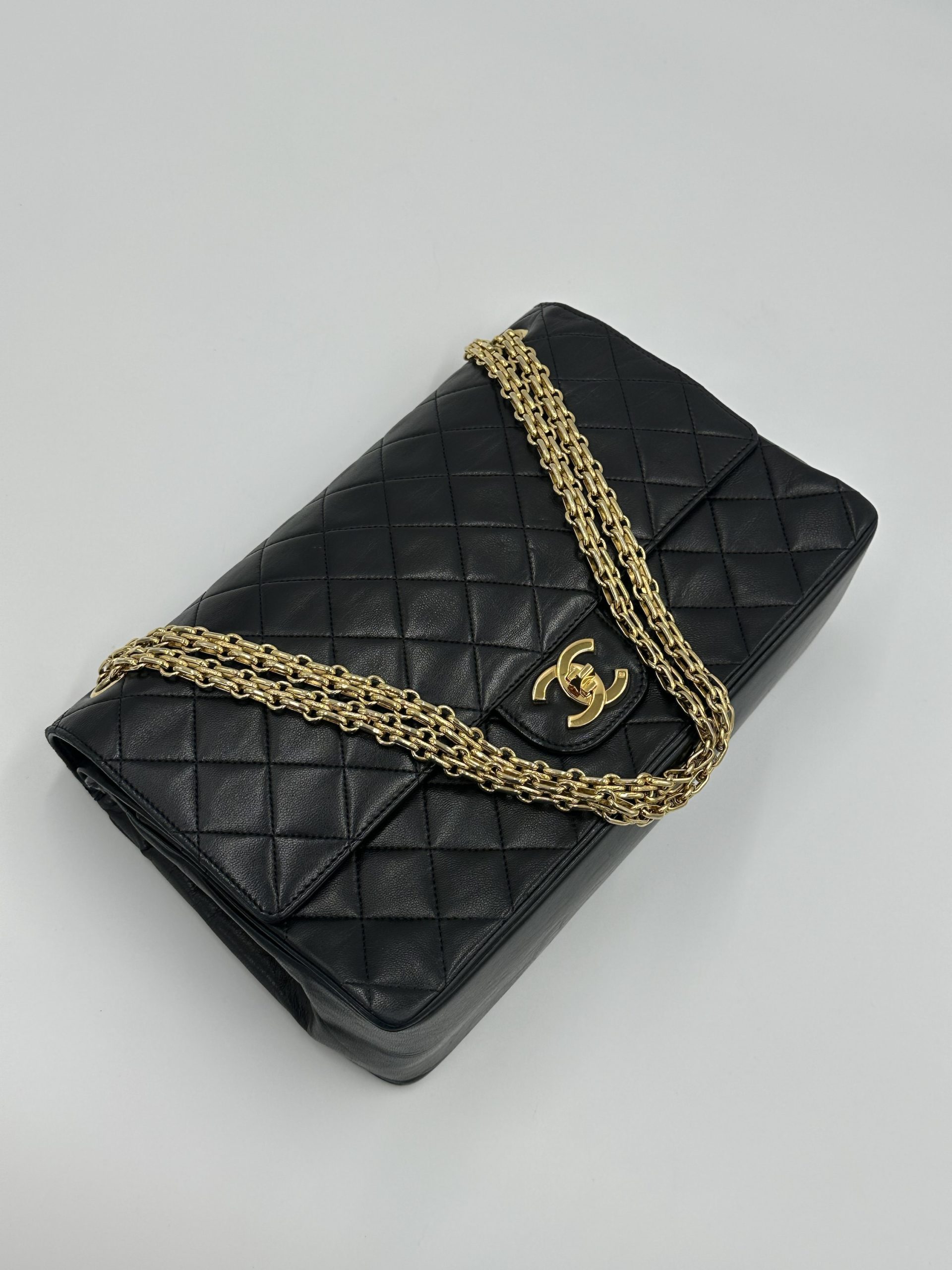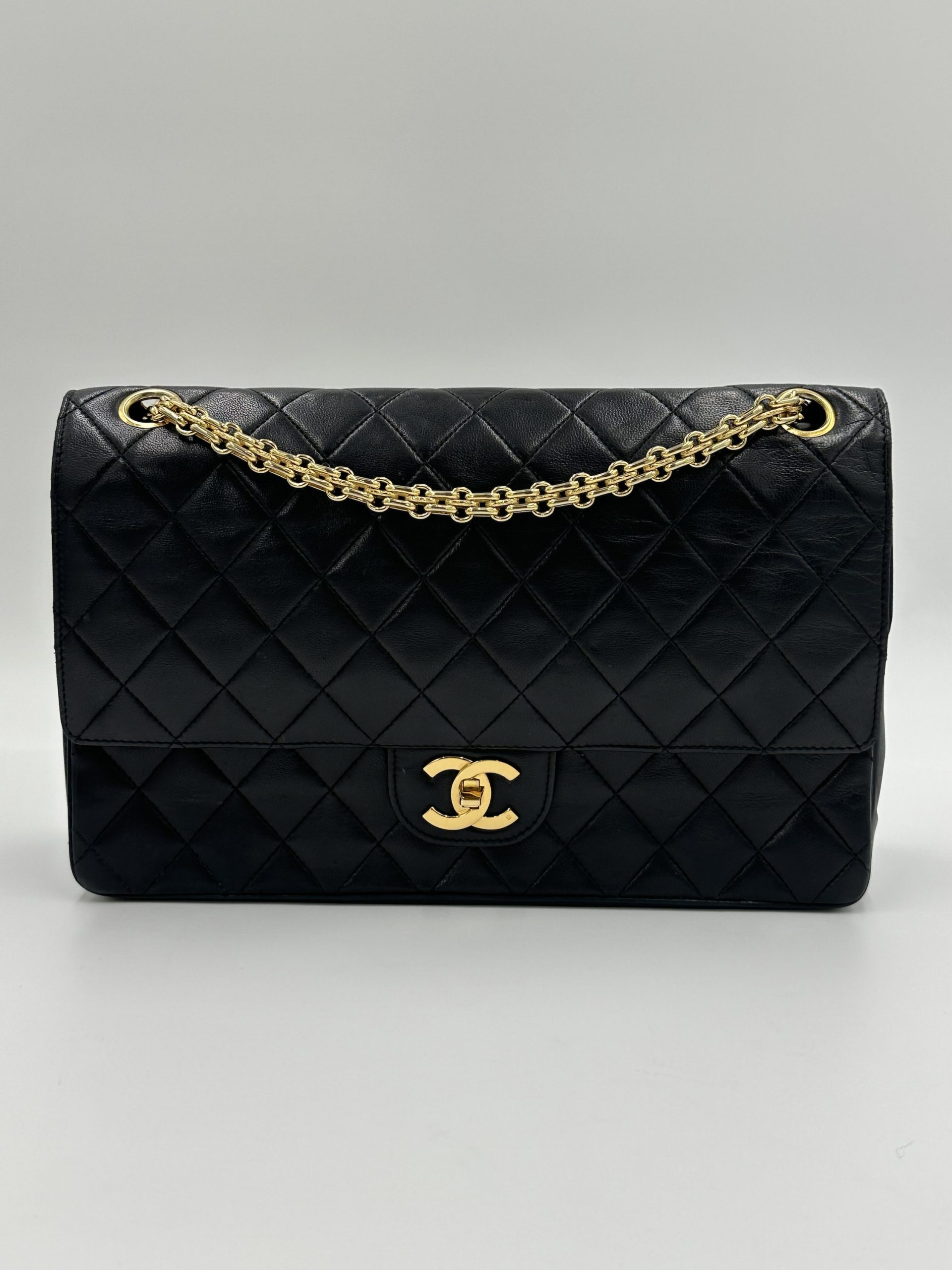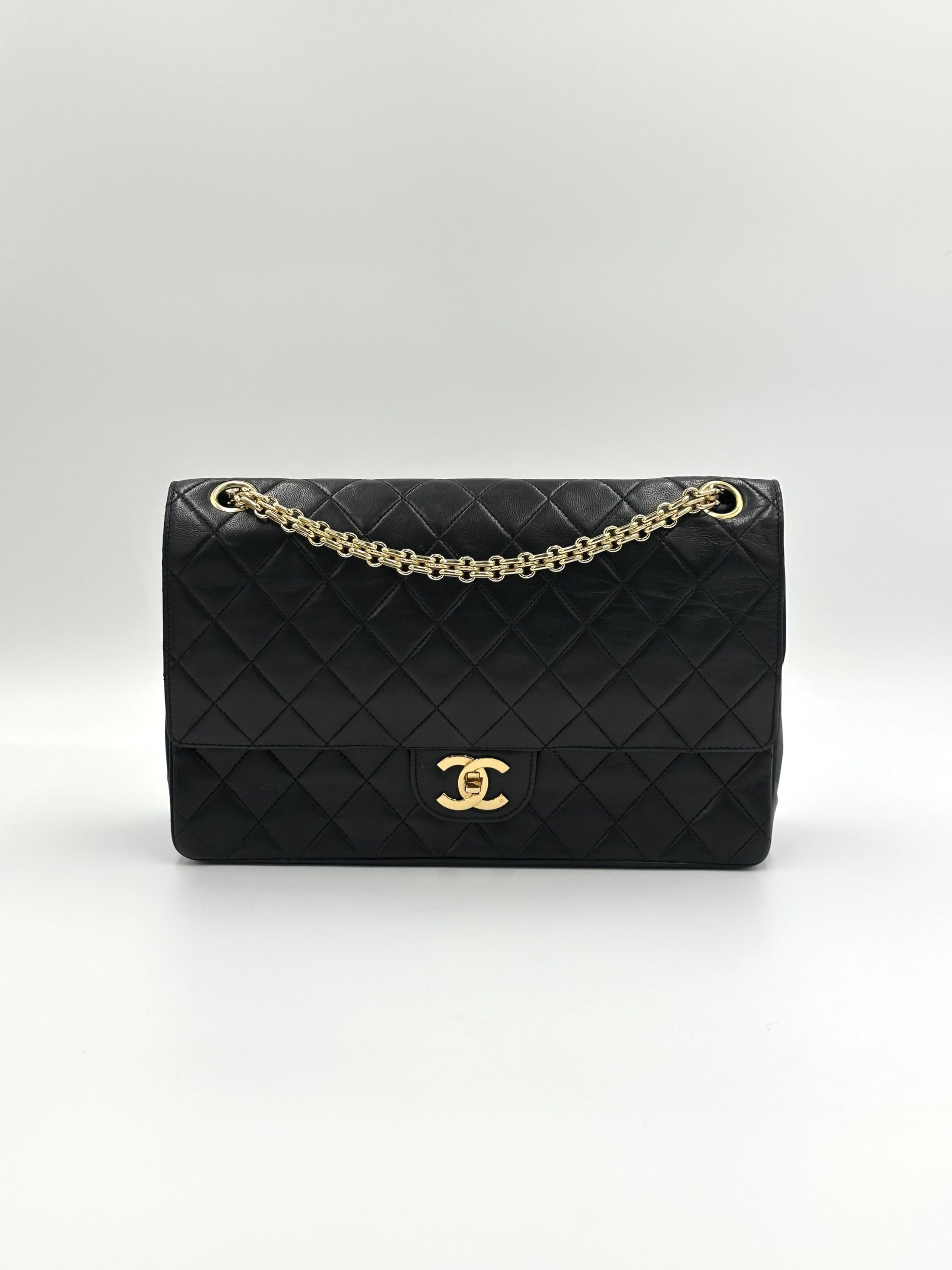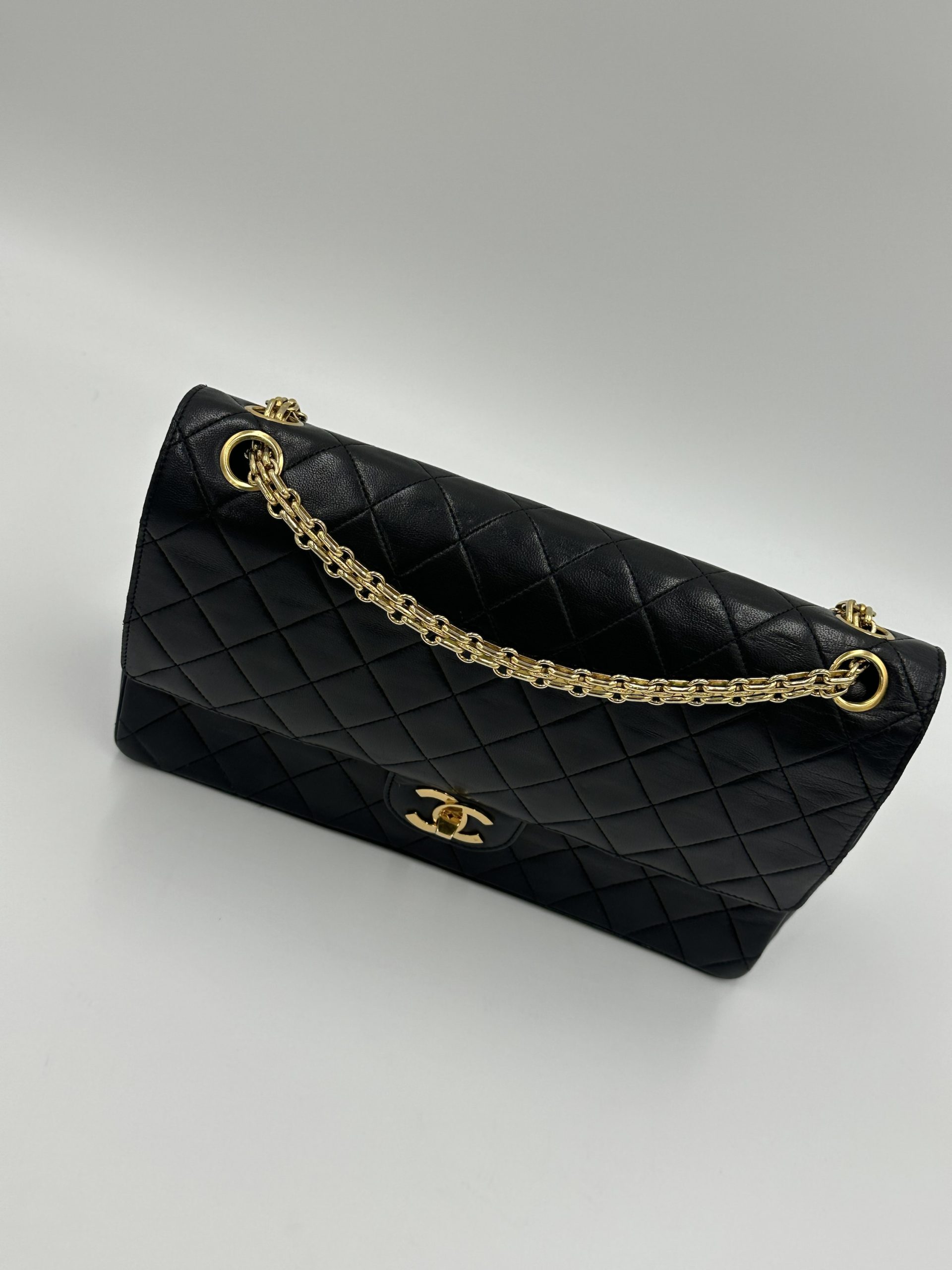 En tidløs Chanel Classic medium double Flap Bag i sort lammeskind og bijoux kæde. Ikonisk quiltet mønster og 24K forgyldt hardware. Denne vintage skat kombinerer sofistikeret elegance med klassisk parisisk chic — et statement piece, der aldrig går af mode.