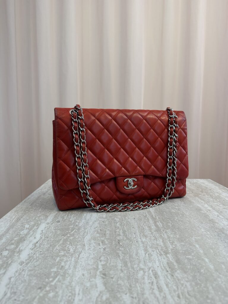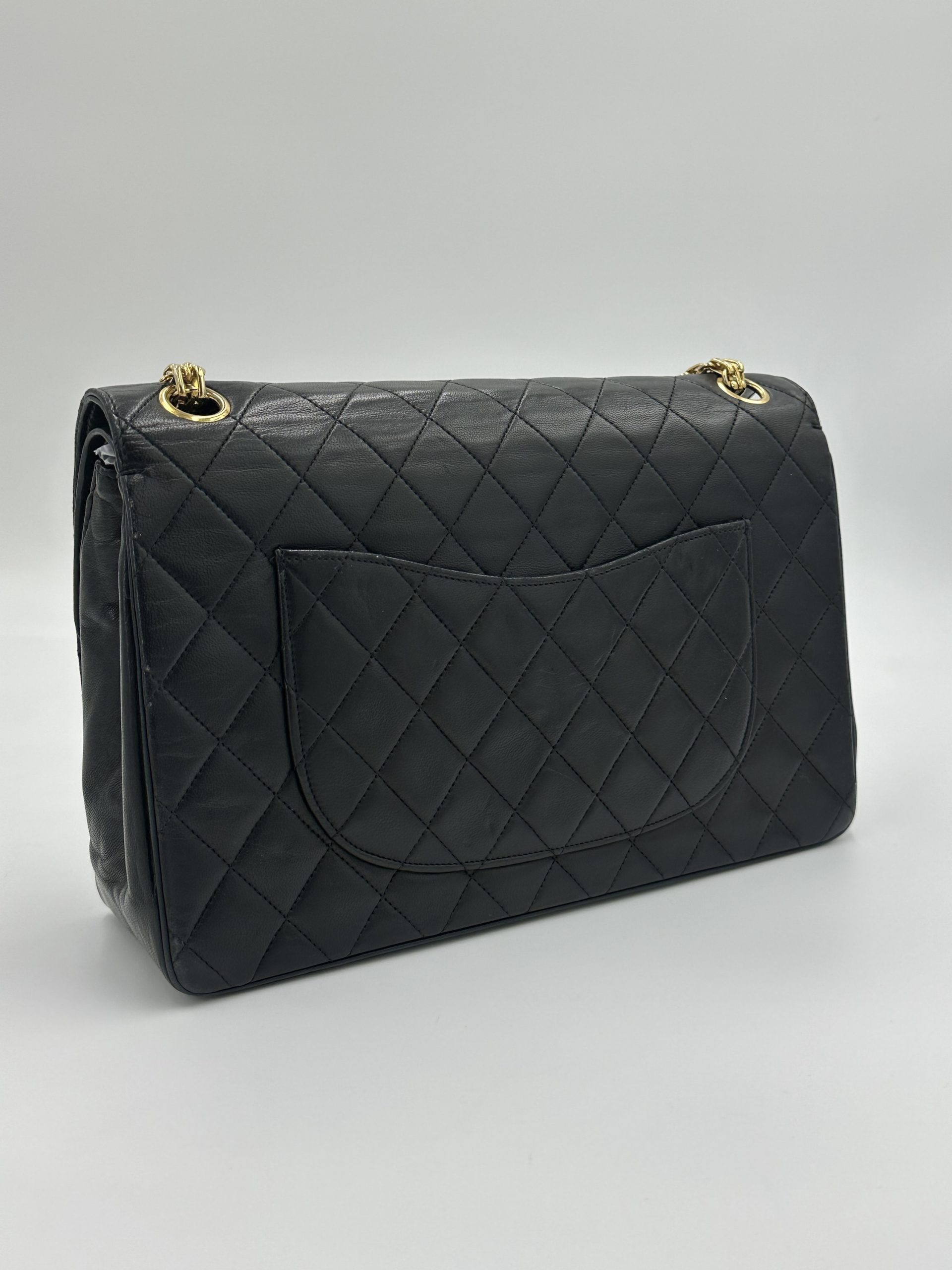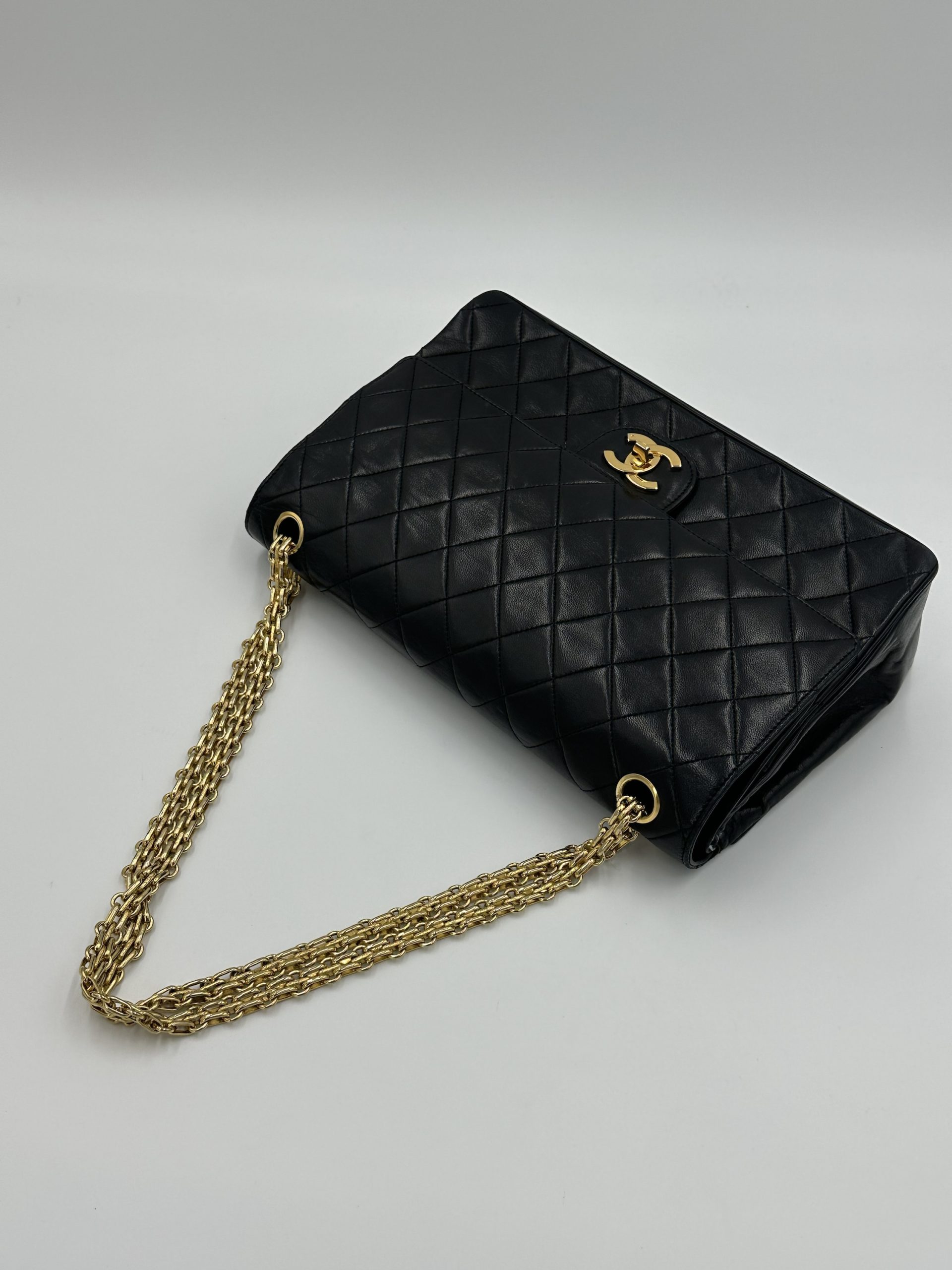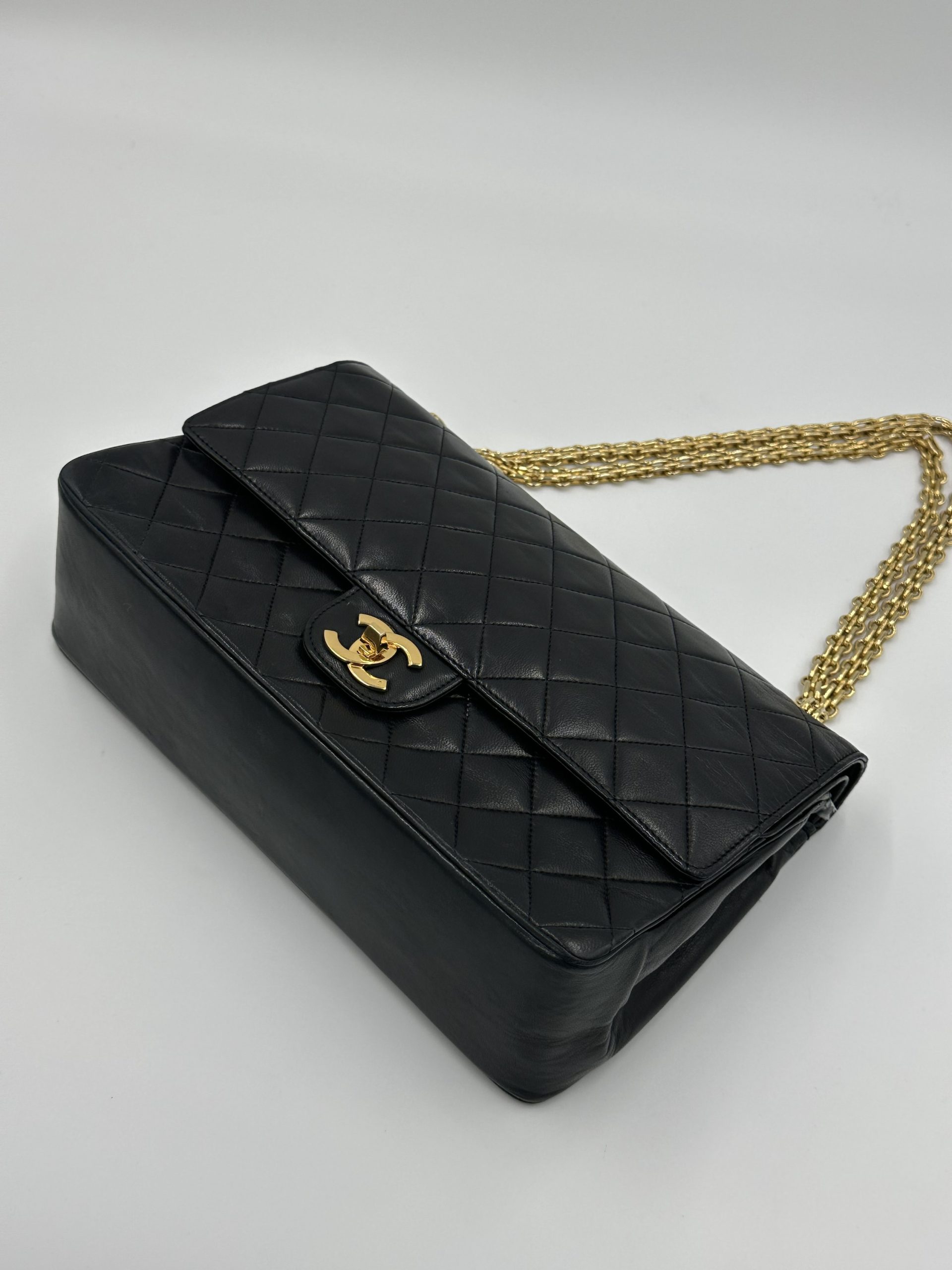 En tidløs Chanel Classic medium double Flap Bag i sort lammeskind og bijoux kæde. Ikonisk quiltet mønster og 24K forgyldt hardware. Denne vintage skat kombinerer sofistikeret elegance med klassisk parisisk chic — et statement piece, der aldrig går af mode.