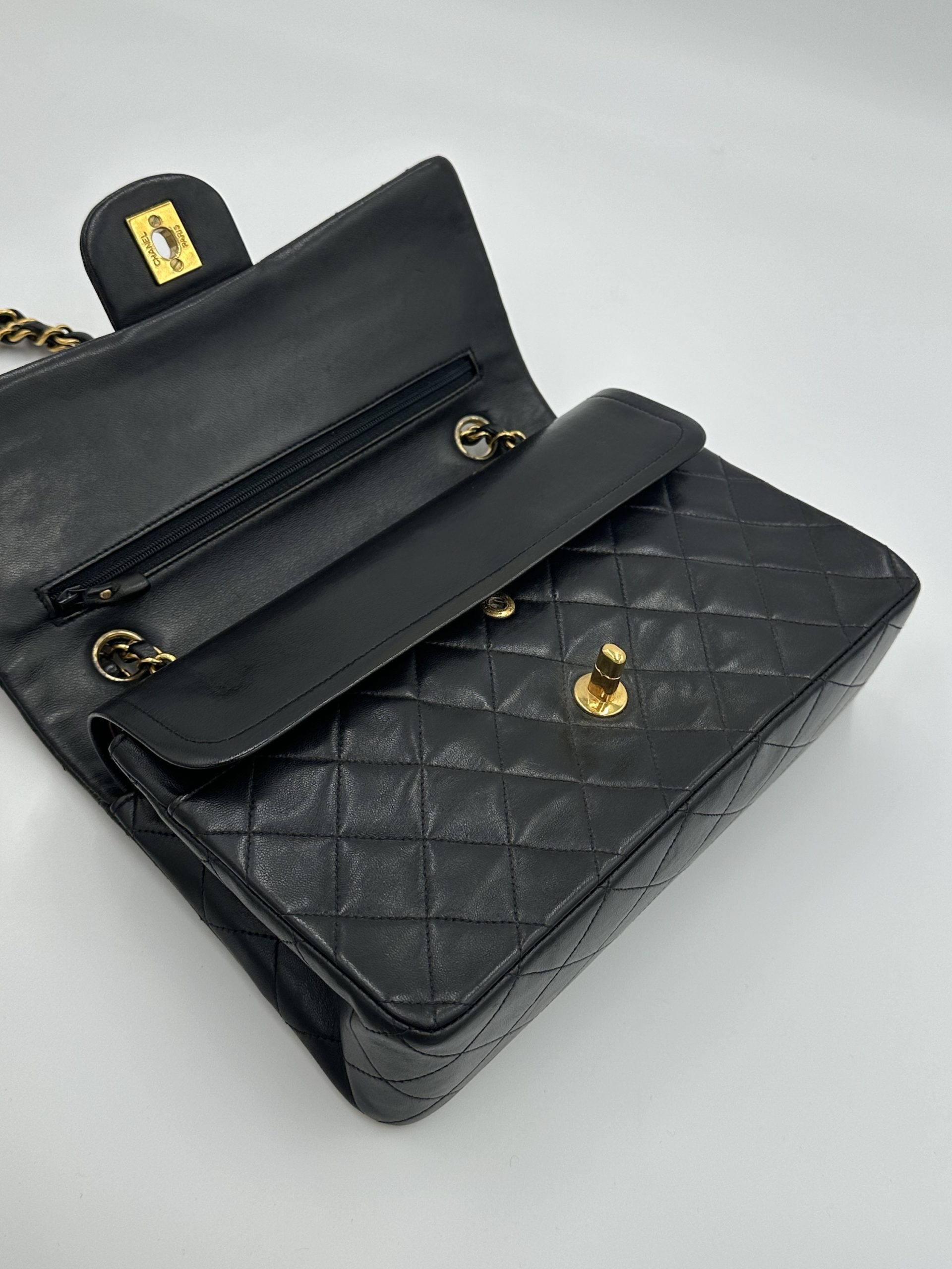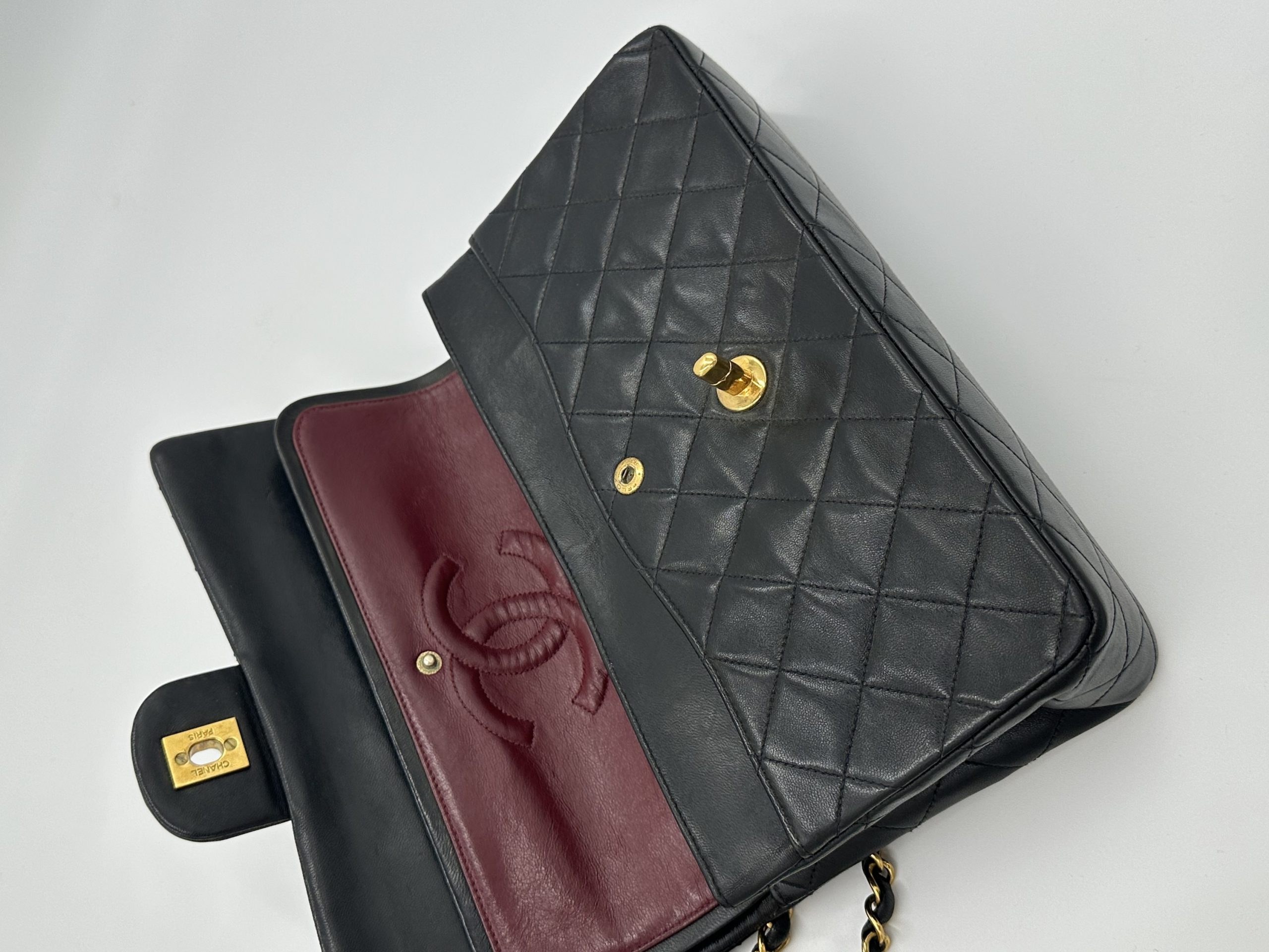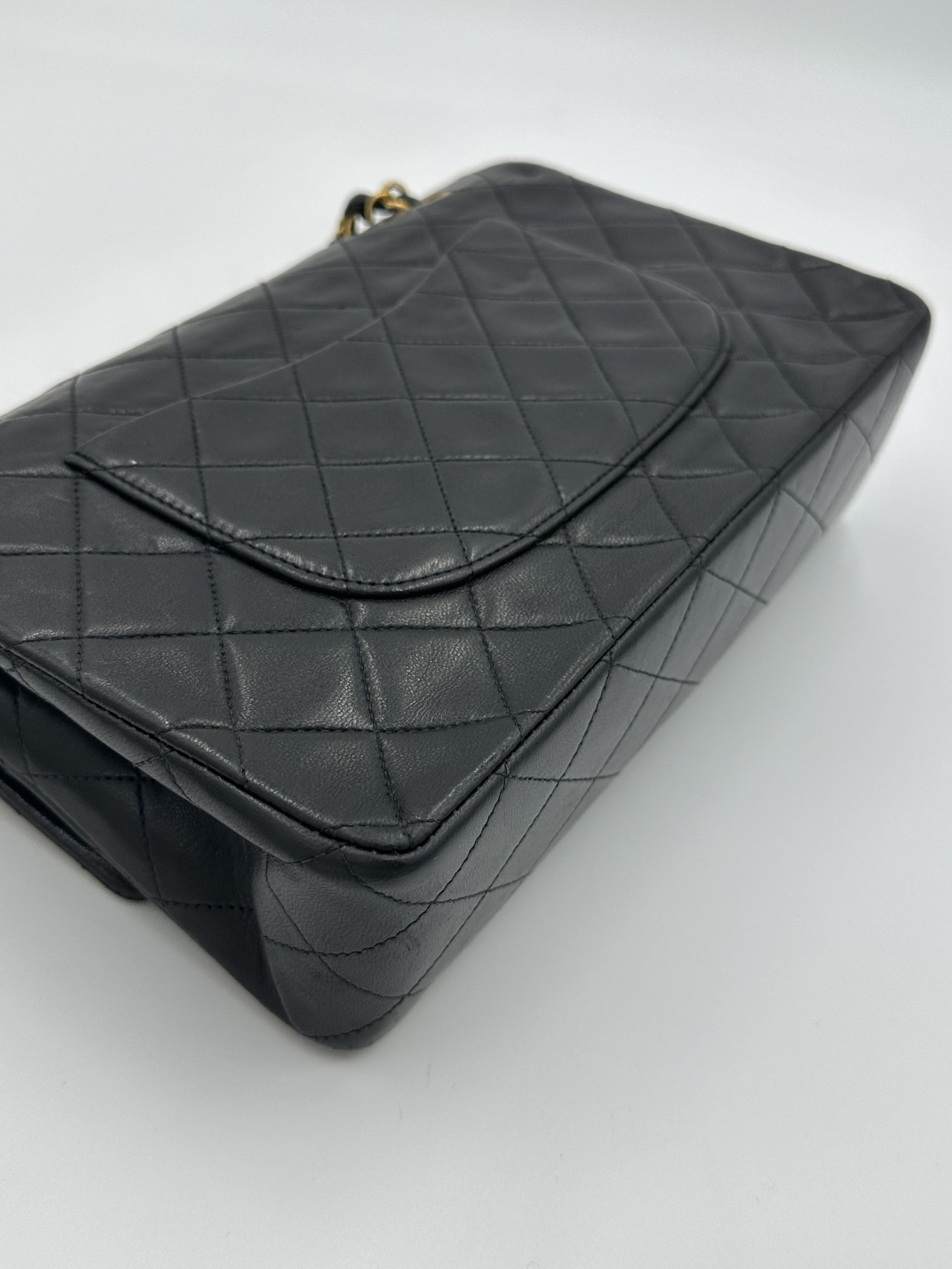 En tidløs Chanel Classic medium double Flap Bag i sort lammeskind med ikonisk quiltet mønster og 24K forgyldt hardware. Denne vintage skat kombinerer sofistikeret elegance med klassisk parisisk chic — et statement piece, der aldrig går af mode. Serienummer fra 1991-1994.