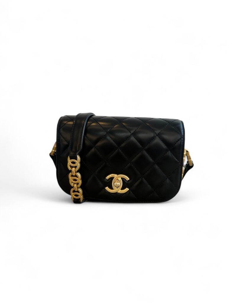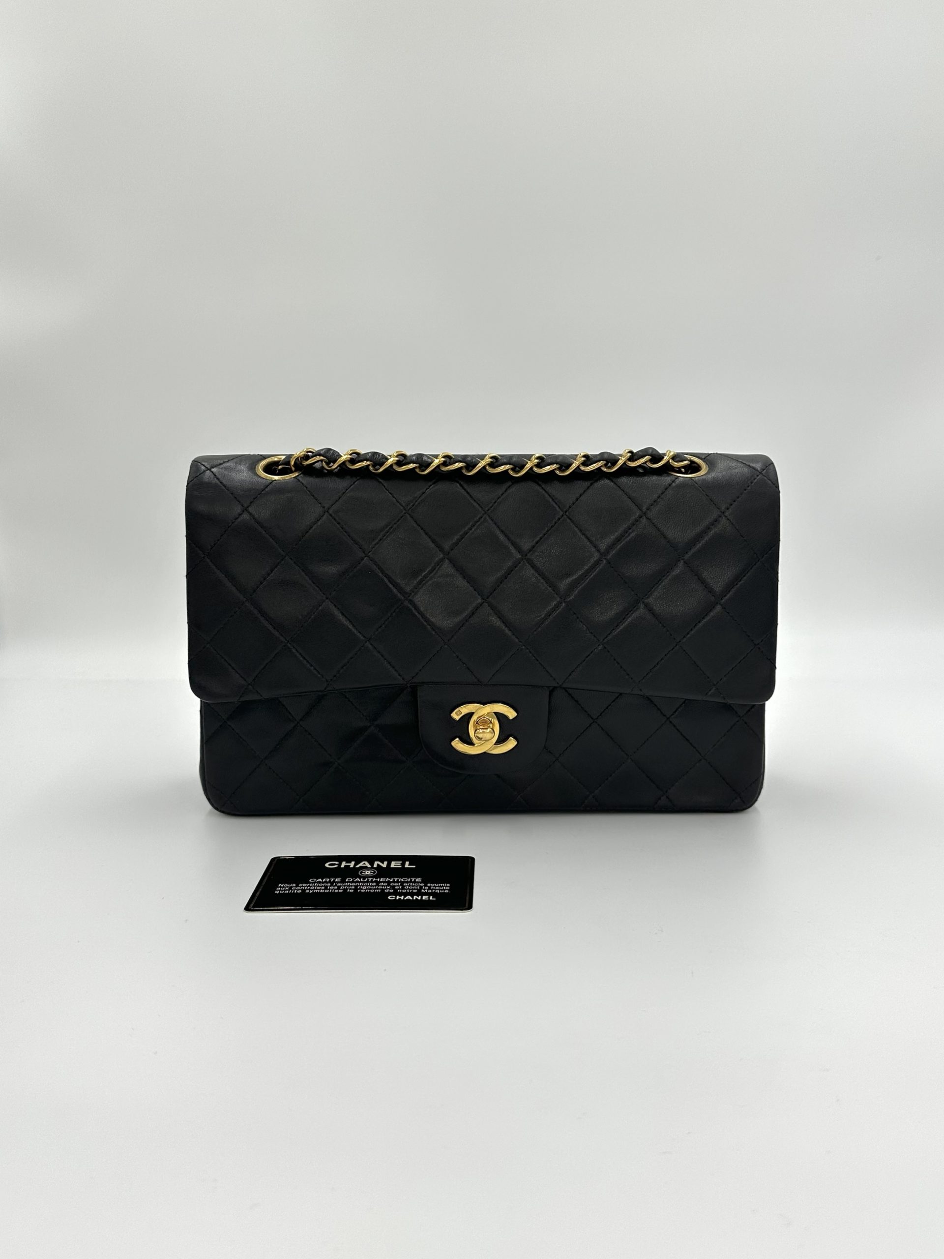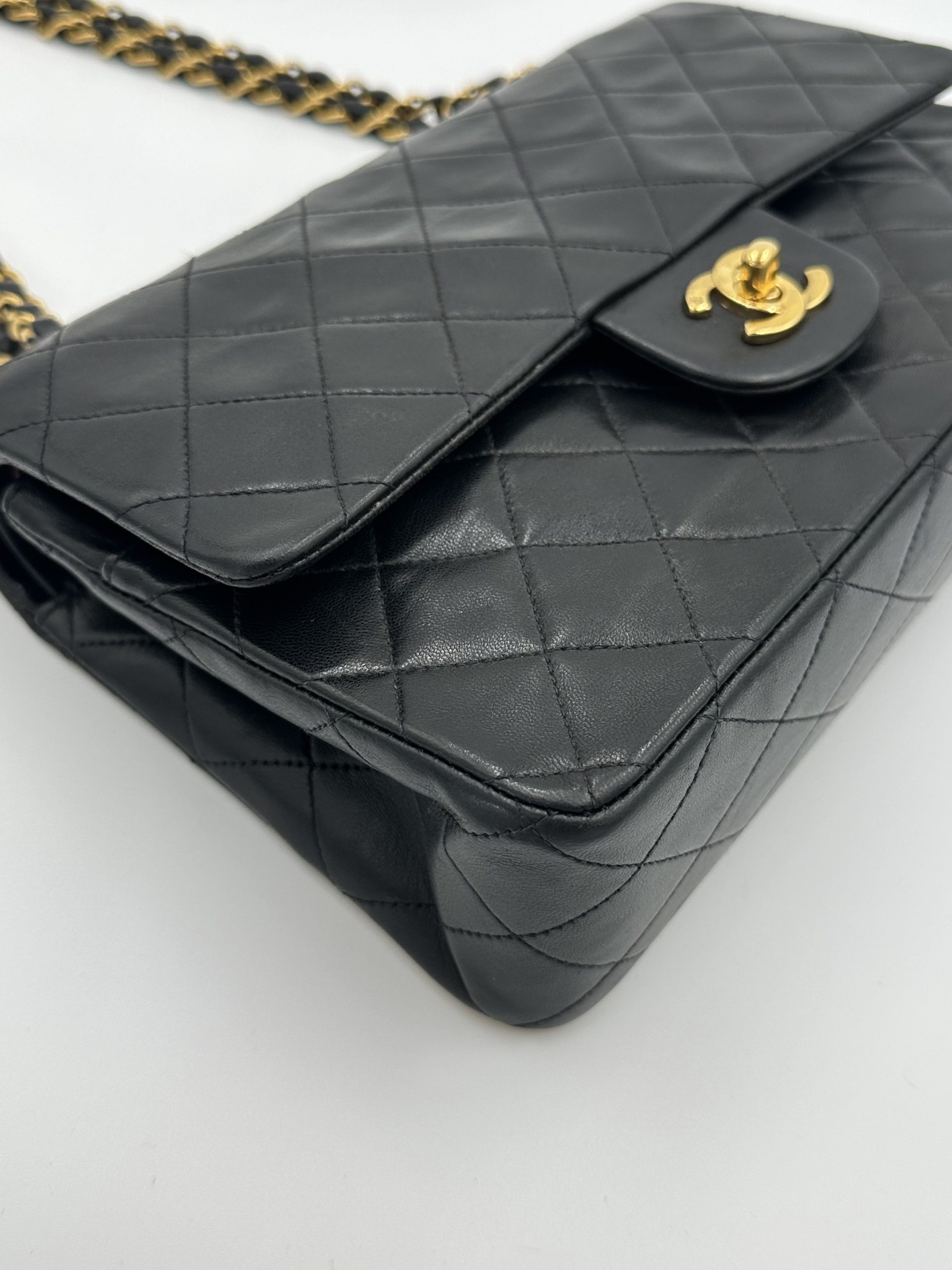 En tidløs Chanel Classic medium double Flap Bag i sort lammeskind med ikonisk quiltet mønster og 24K forgyldt hardware. Denne vintage skat kombinerer sofistikeret elegance med klassisk parisisk chic — et statement piece, der aldrig går af mode. Serienummer fra 1991-1994.