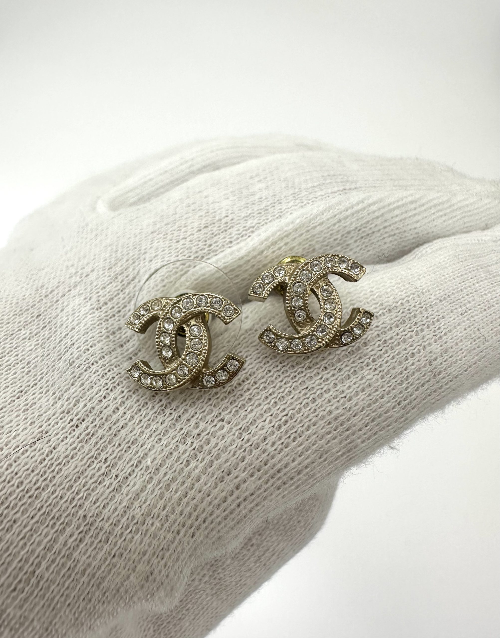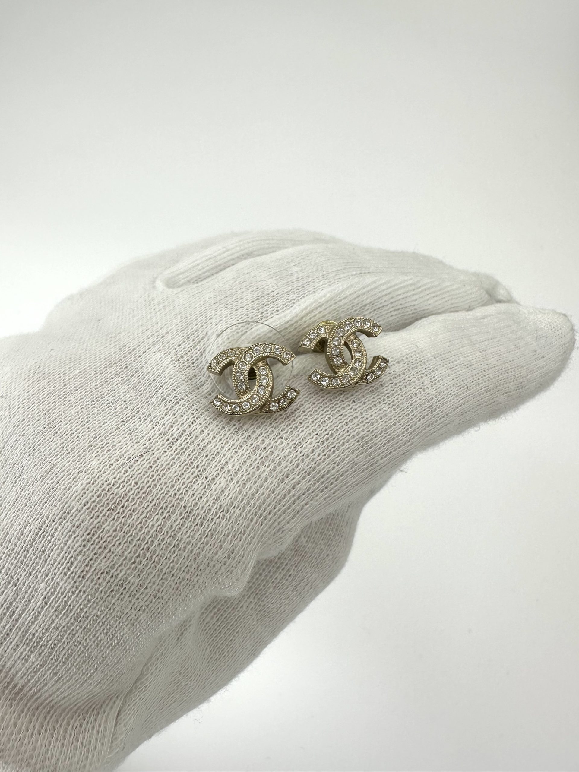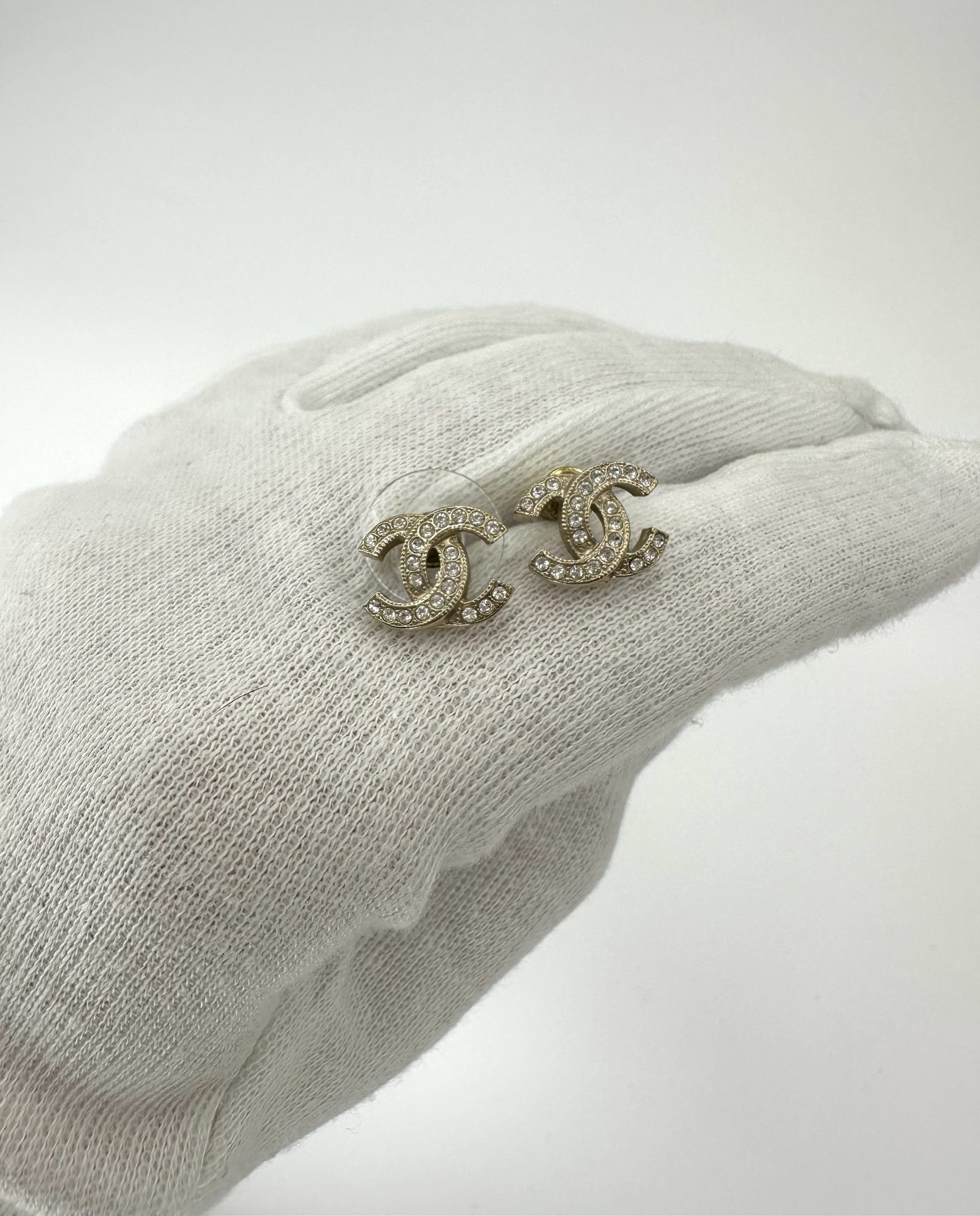 Elegante Chanel ørestikker i guldfinish med det ikoniske CC-logo fuldt besat med klare krystaller. En klassiker fra Chanel, der giver et luksuriøst, men stadig subtilt sparkle — perfekte til både hverdag og fest.