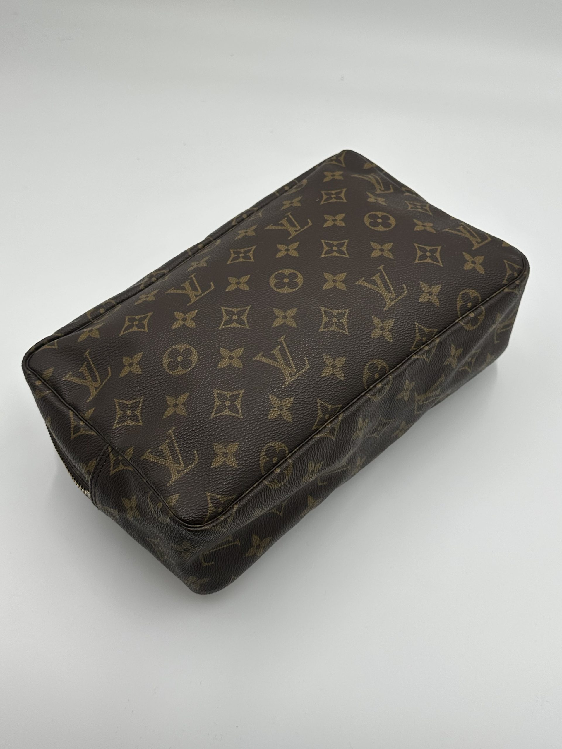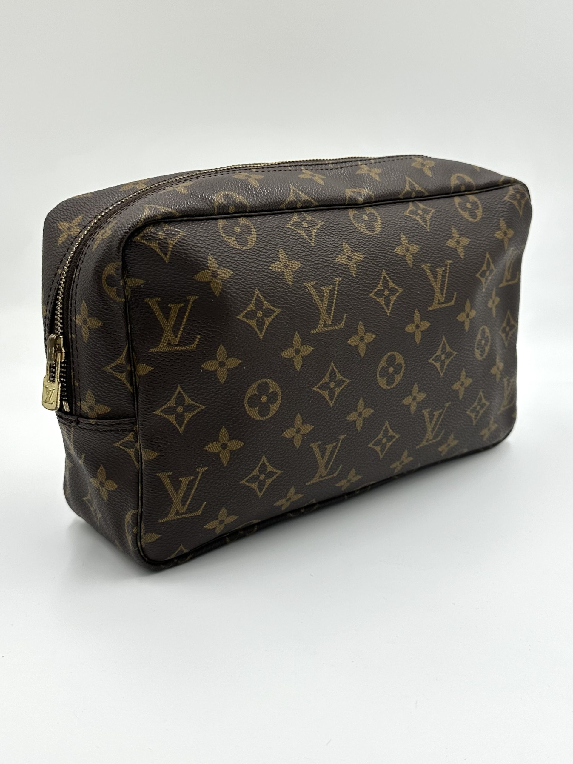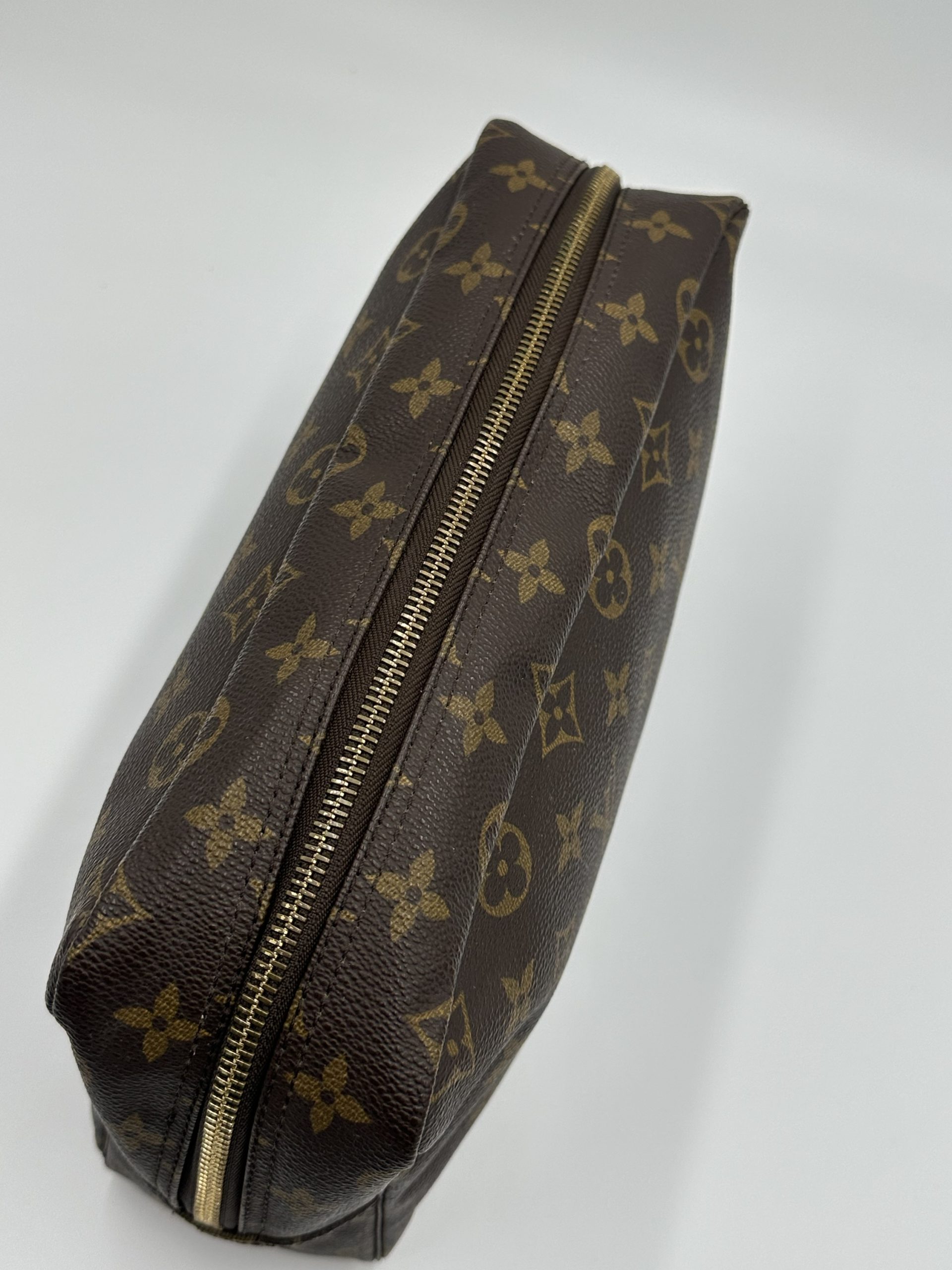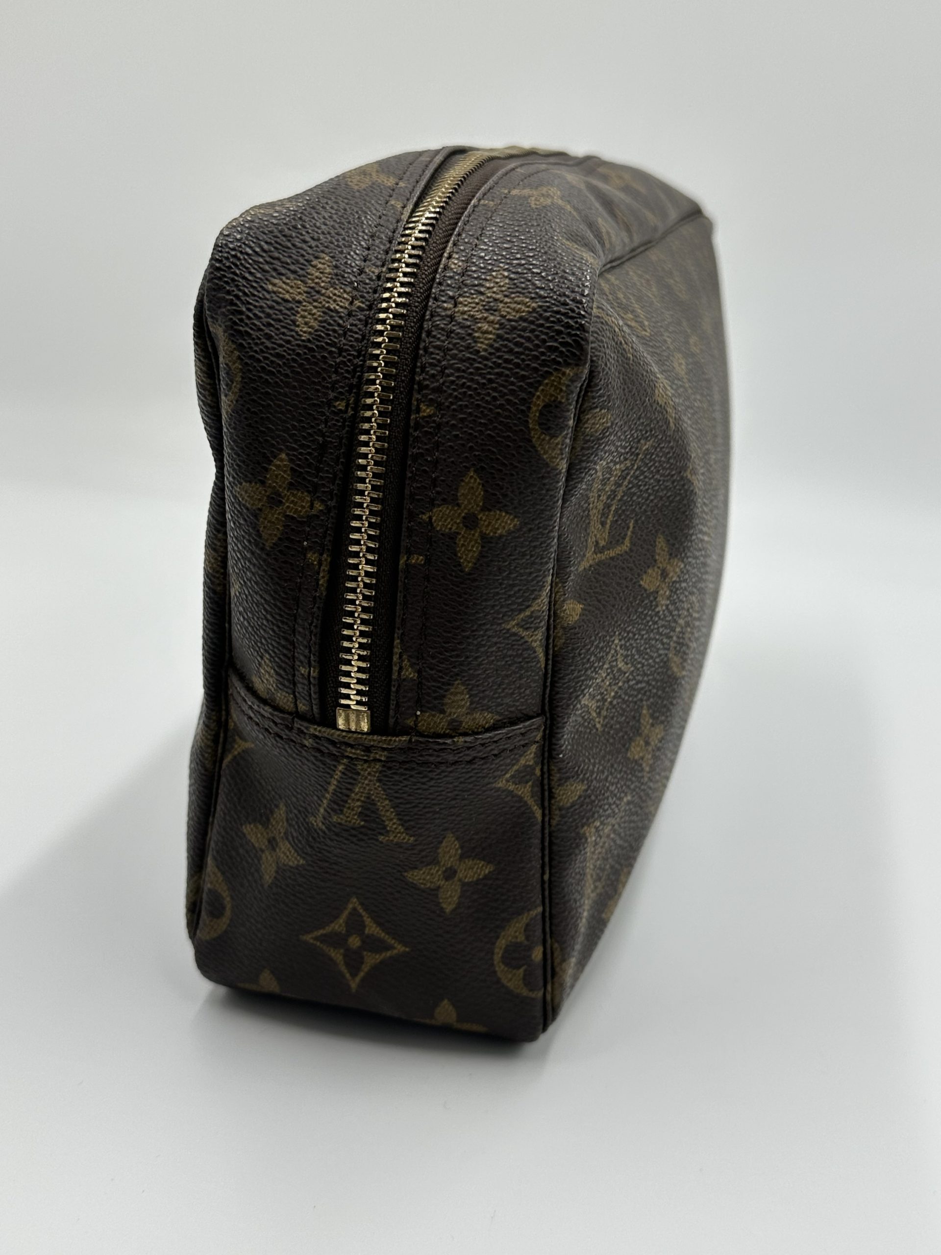 En klassisk og funktionel Louis Vuitton toilettaske i ikonisk Monogram Canvas – perfekt til både rejser og daglig organisering. Det robuste coated canvas, den enkle boksform og den rummelige indretning gør den til en uundværlig accessory for enhver, der elsker tidløst design.