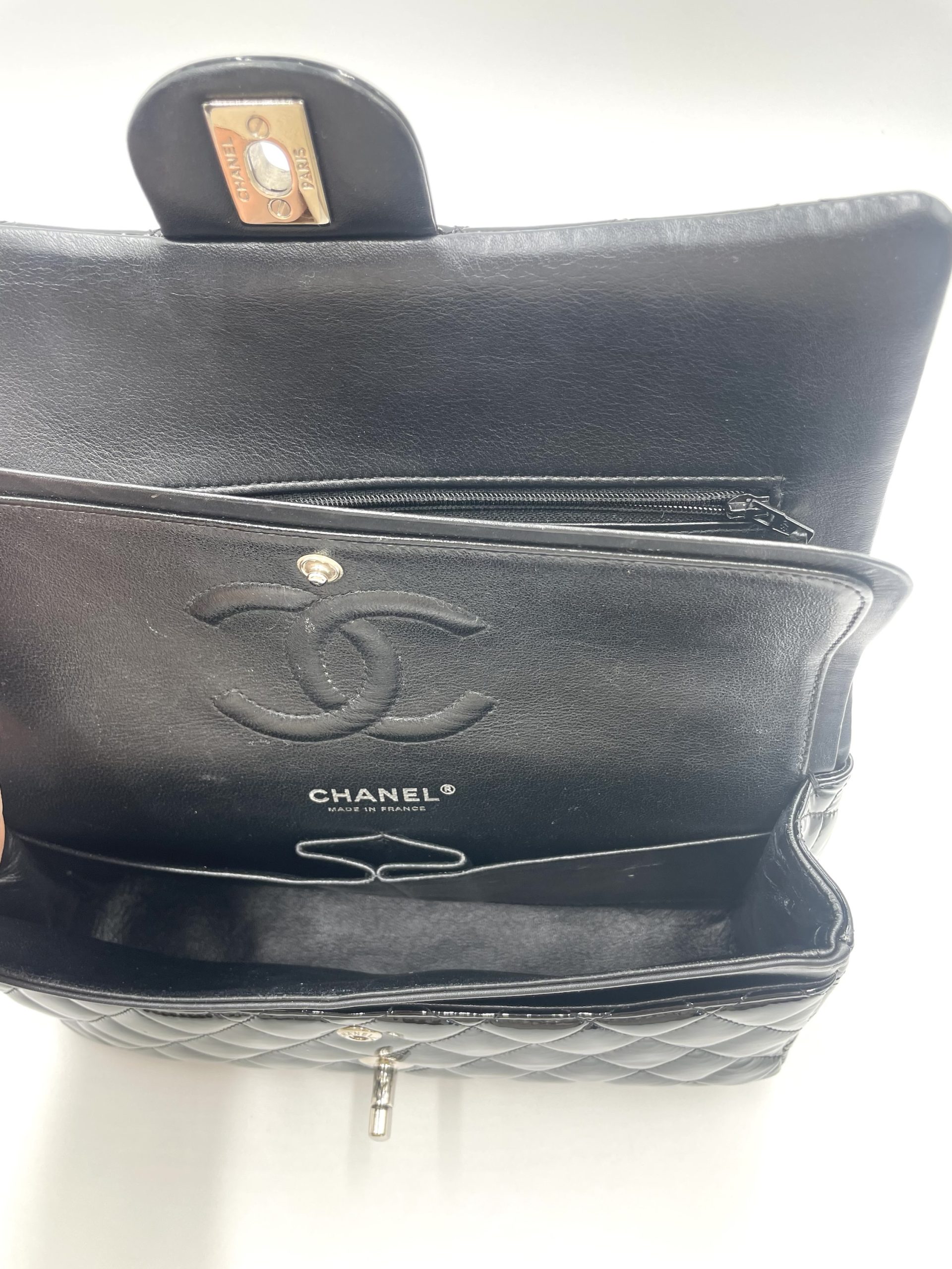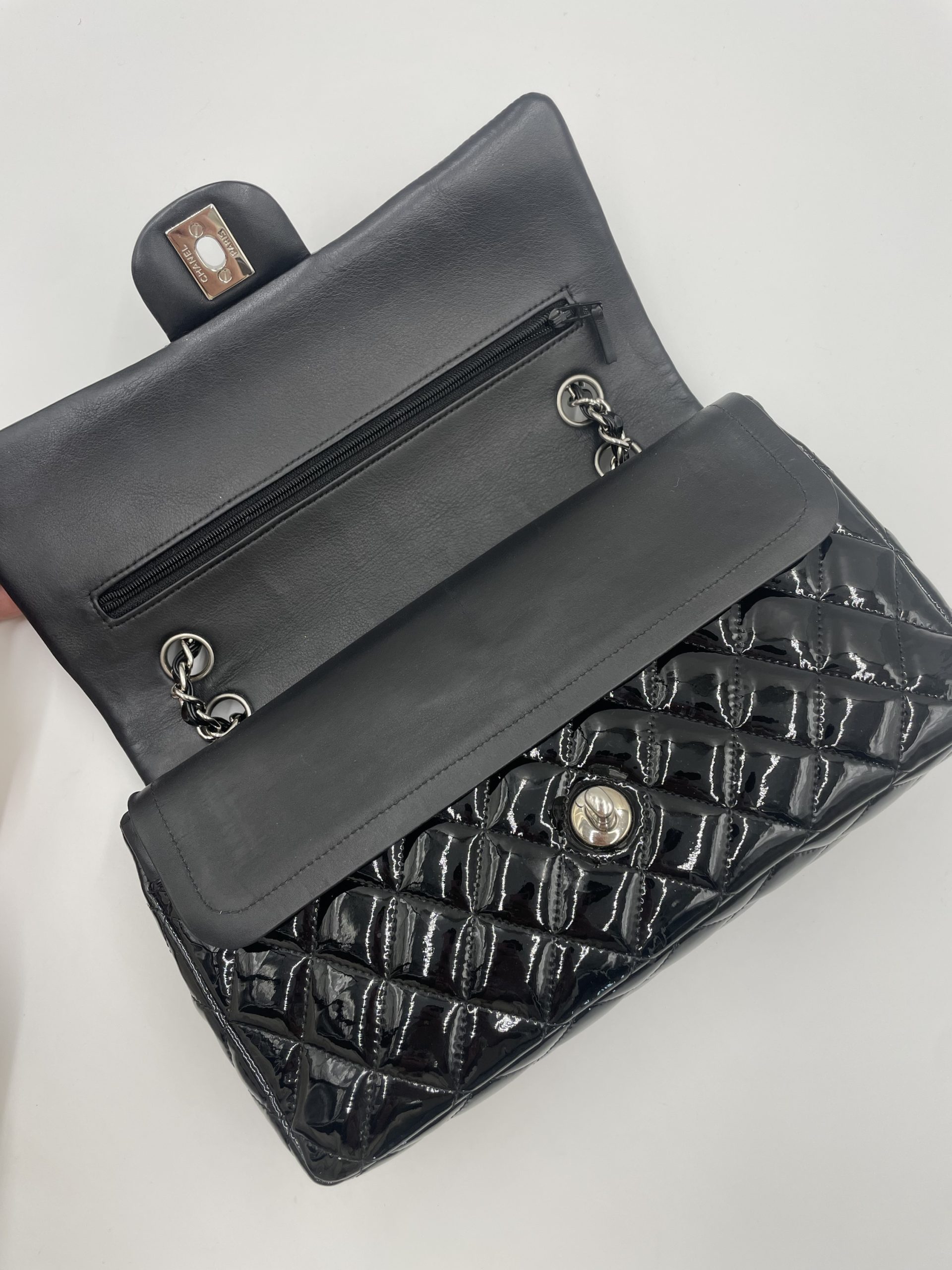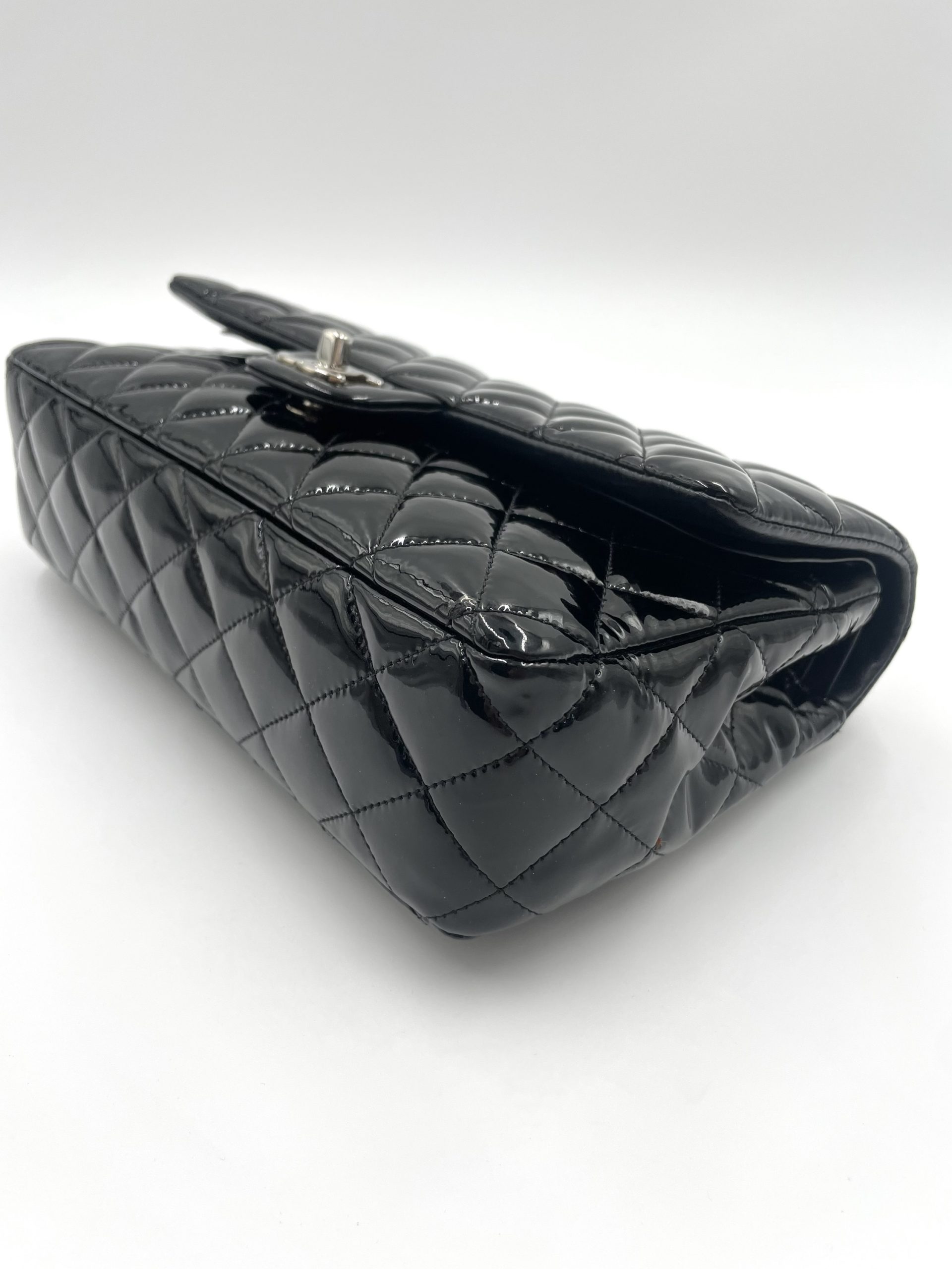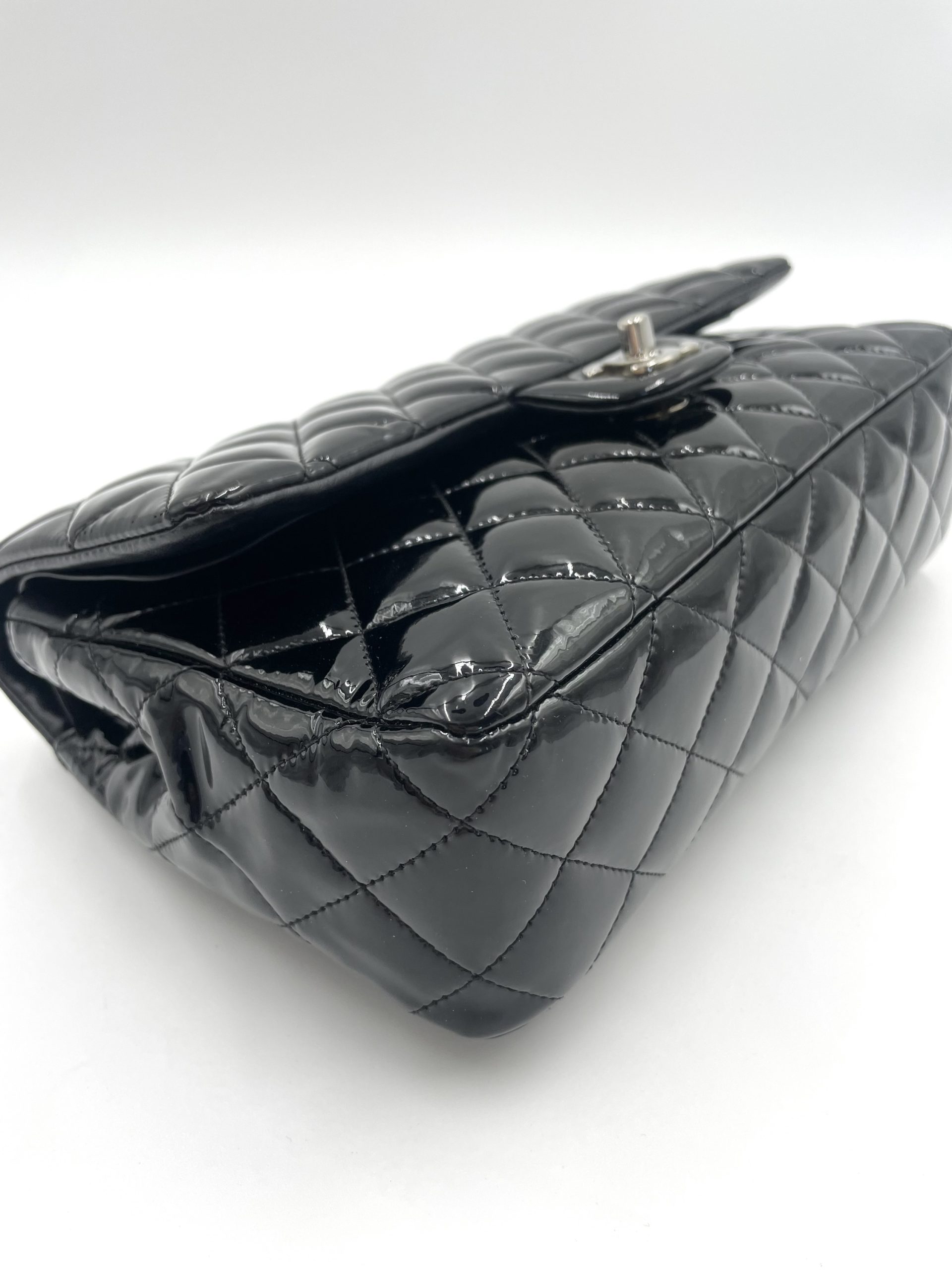 Den quiltede lakoverflade reflekterer lyset smukt og fremhæver de ikoniske detaljer som CC-låsen og den flettede kæderem – elementer, der har defineret Chanel siden 1955 . Samtidig er modellen en del af en af verdens mest eftertragtede taskeserier, der fortsat er blandt de mest værdifulde og populære på preloved markedet .