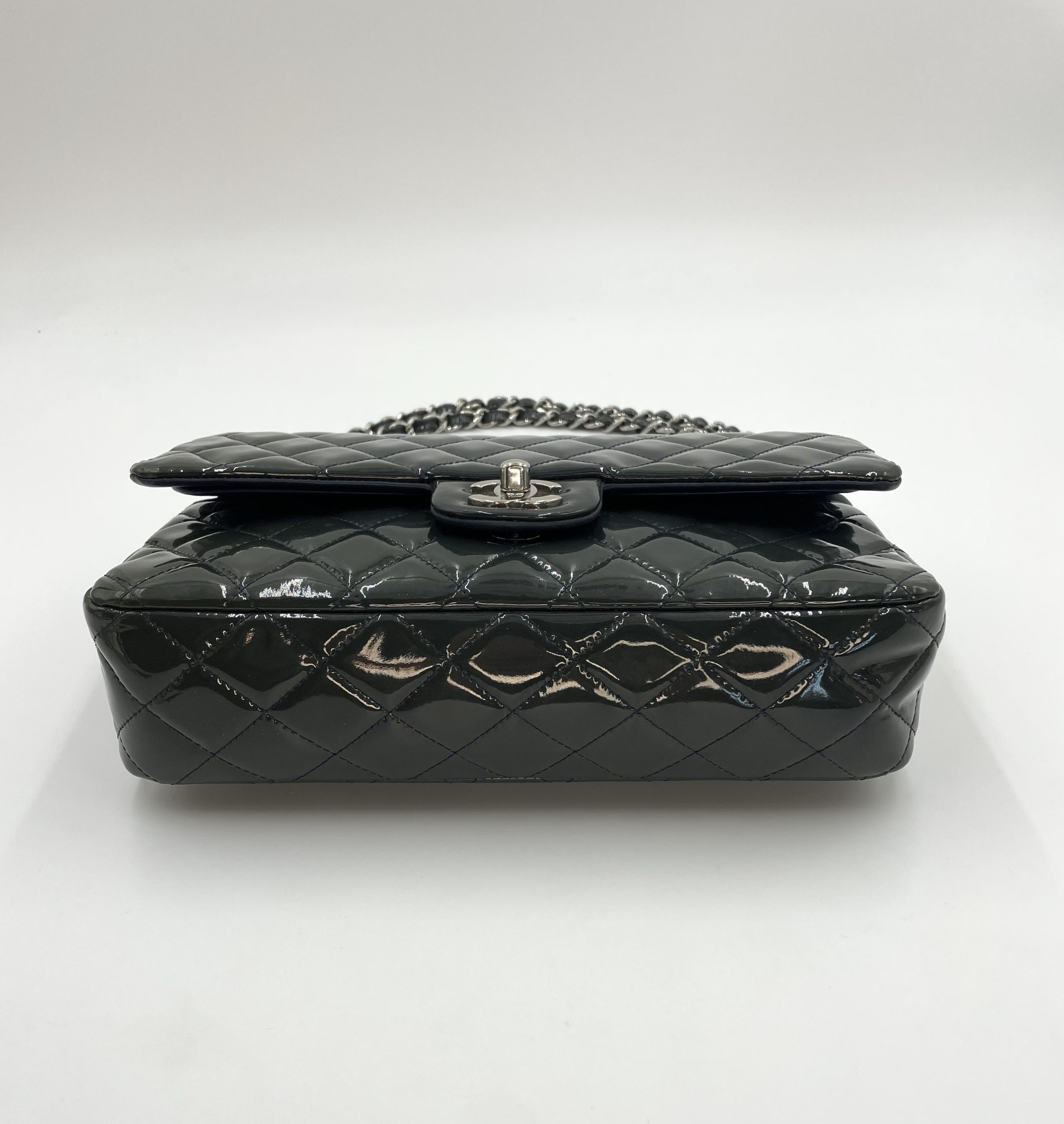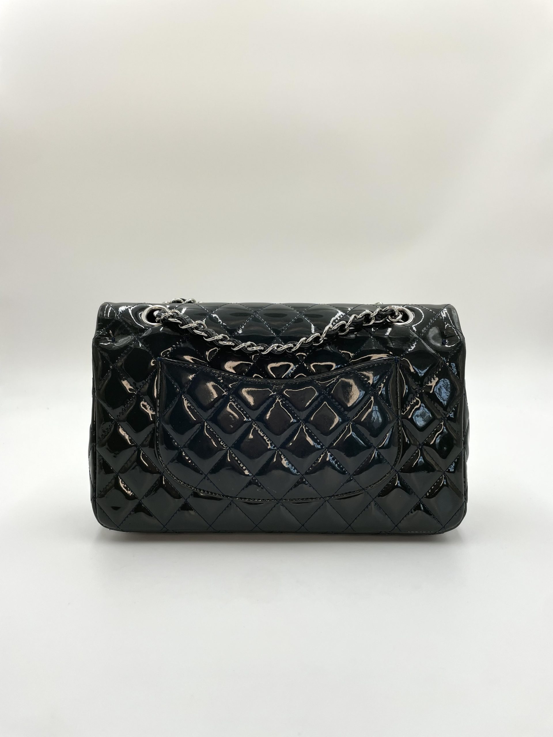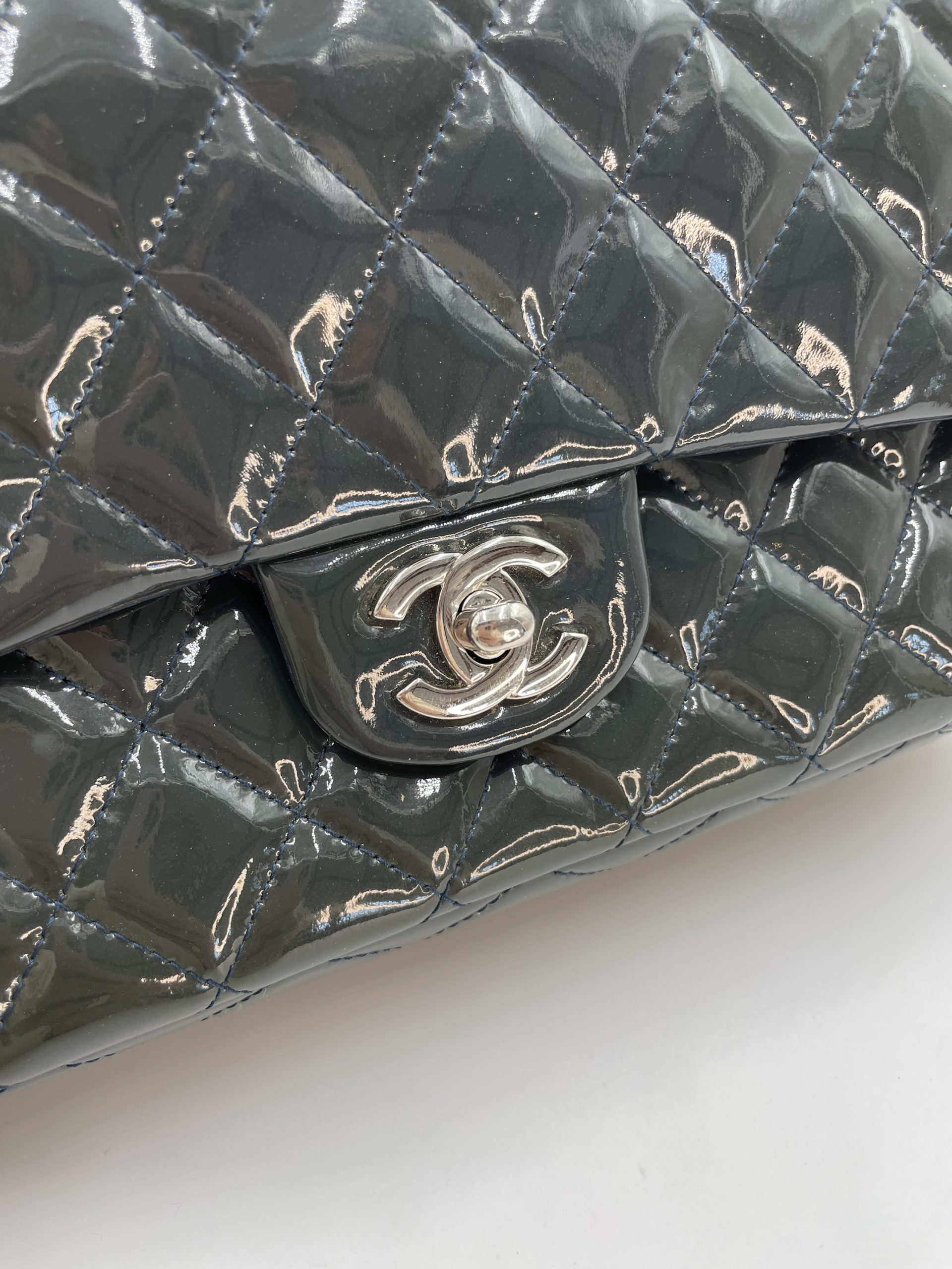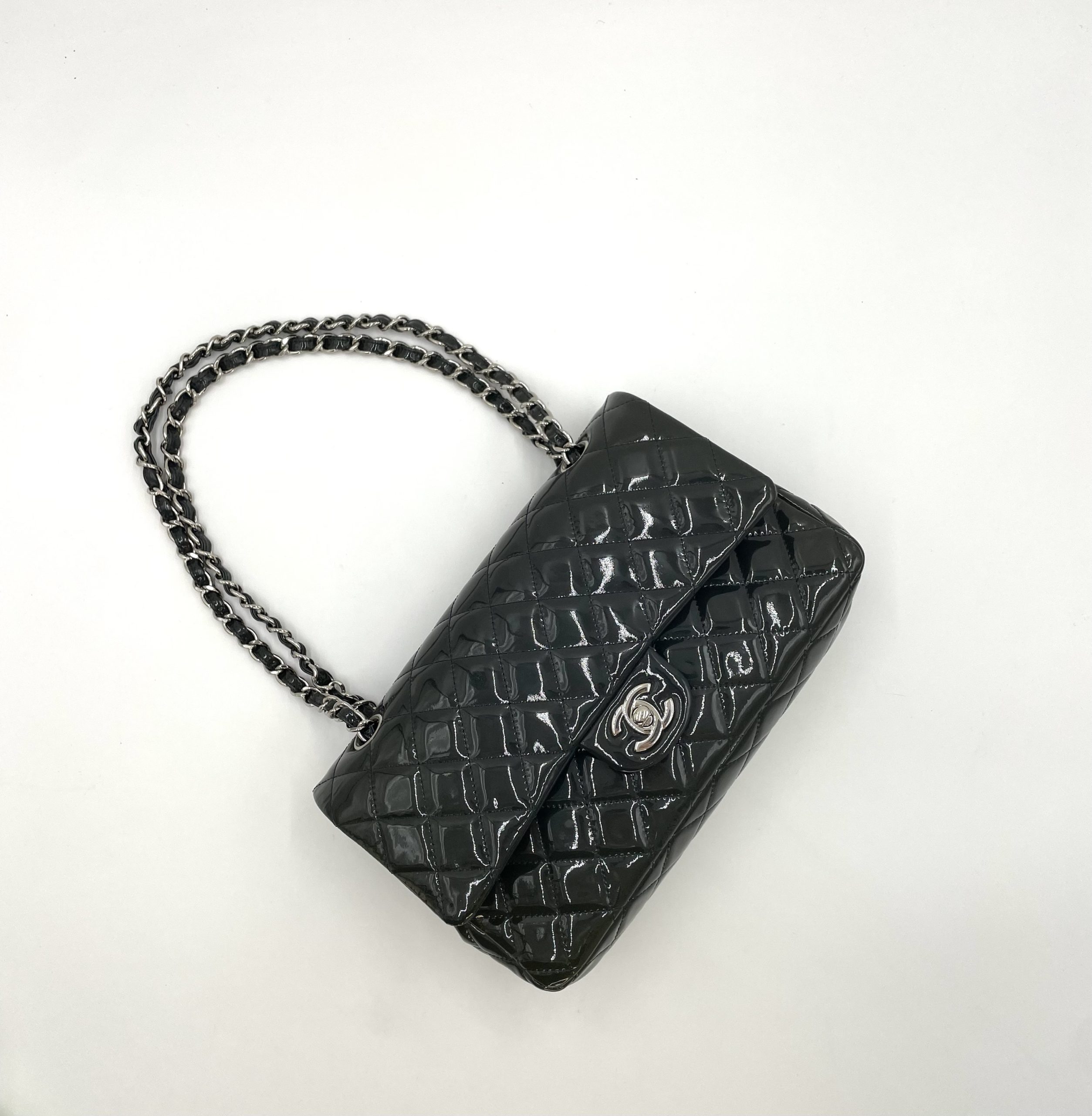 Elegant Chanel Classic Flap i blankt patent leather, der giver tasken et mere edgy og moderne udtryk end den klassiske lambskin. Den glossy overflade reflekterer lyset smukt og fremhæver det ikoniske quiltede design.