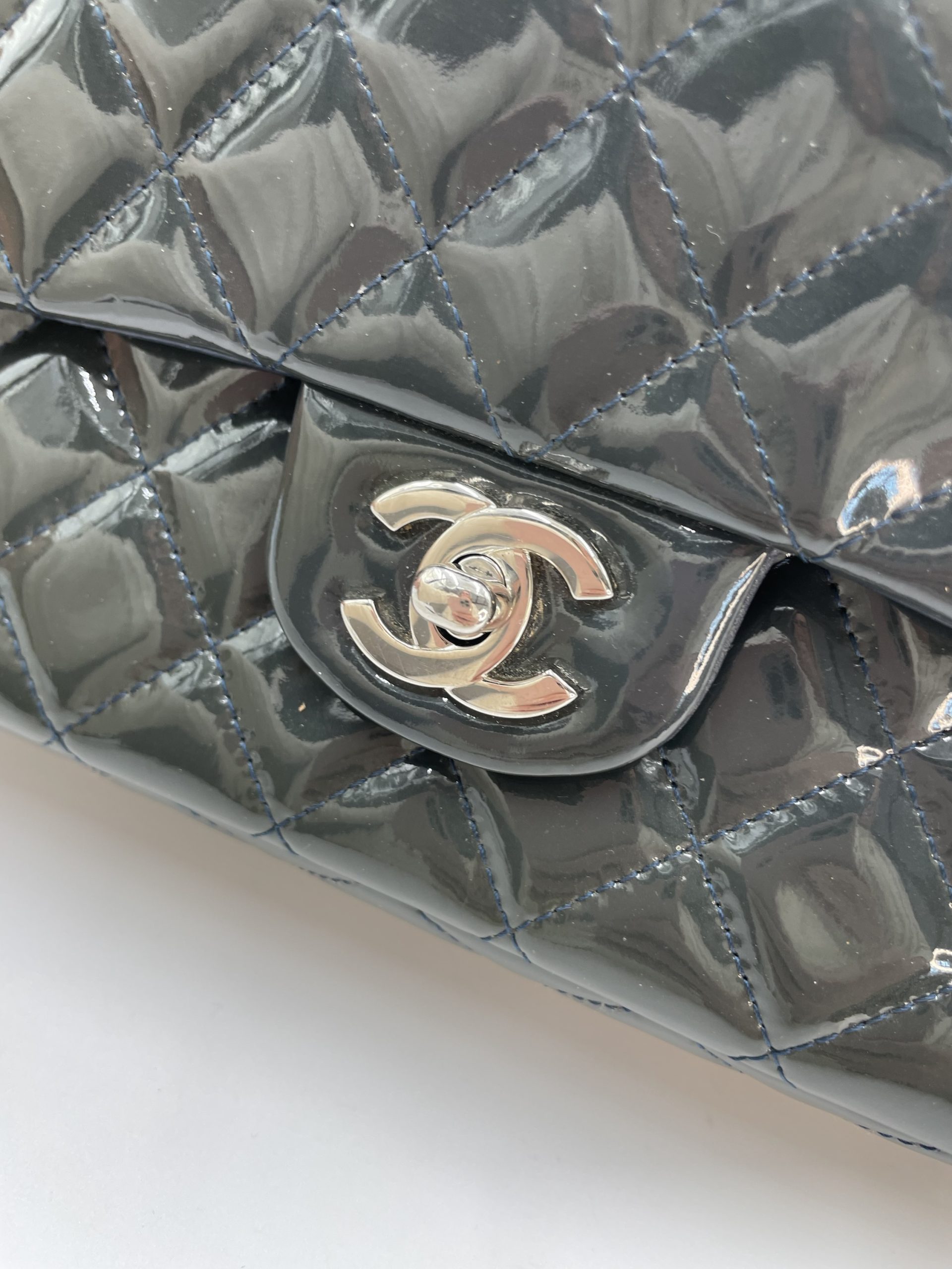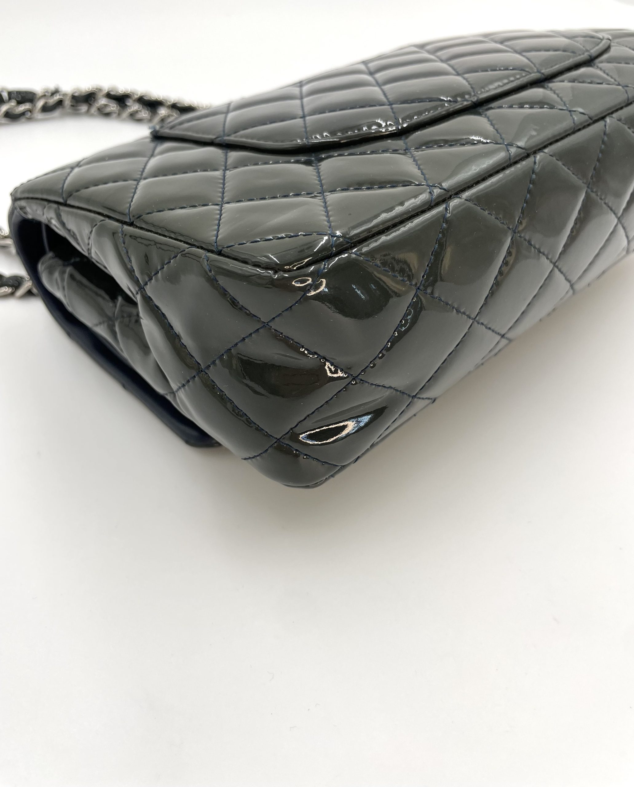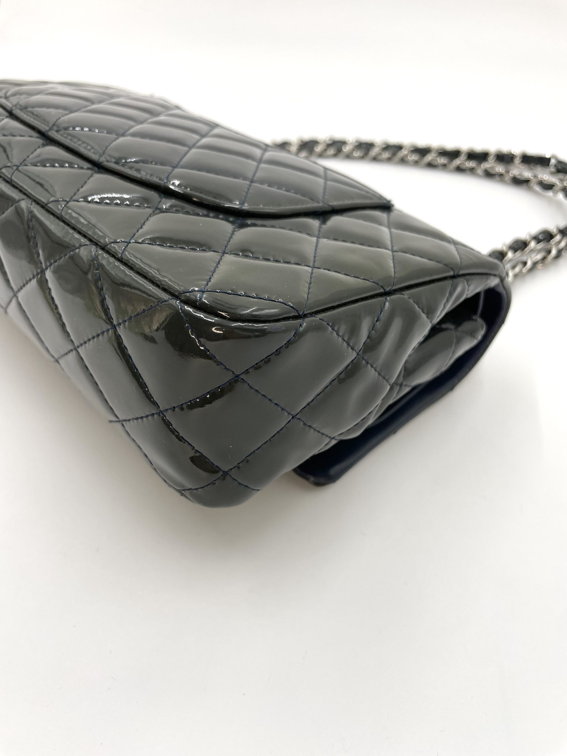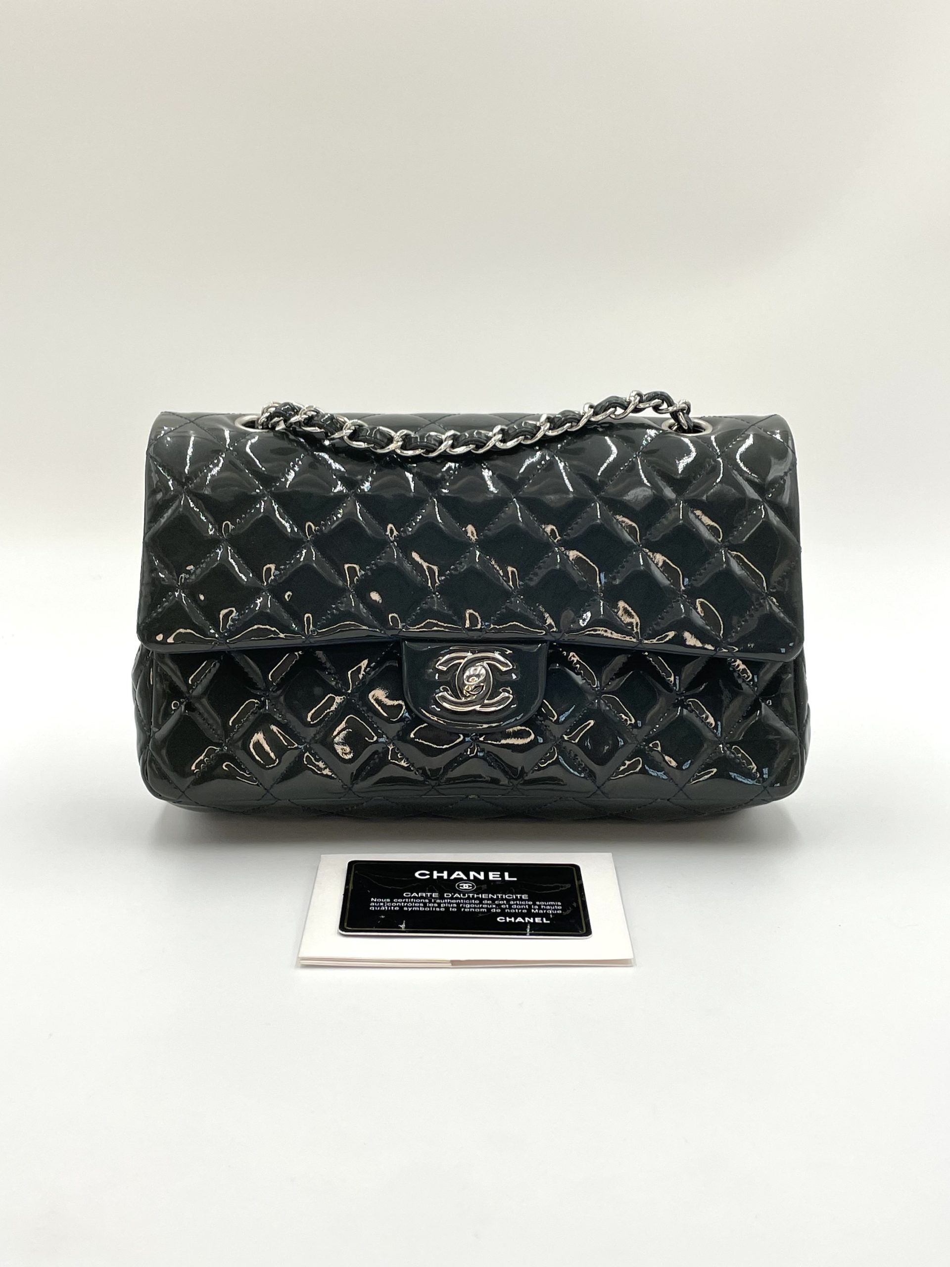 Elegant Chanel Classic Flap i blankt patent leather, der giver tasken et mere edgy og moderne udtryk end den klassiske lambskin. Den glossy overflade reflekterer lyset smukt og fremhæver det ikoniske quiltede design.