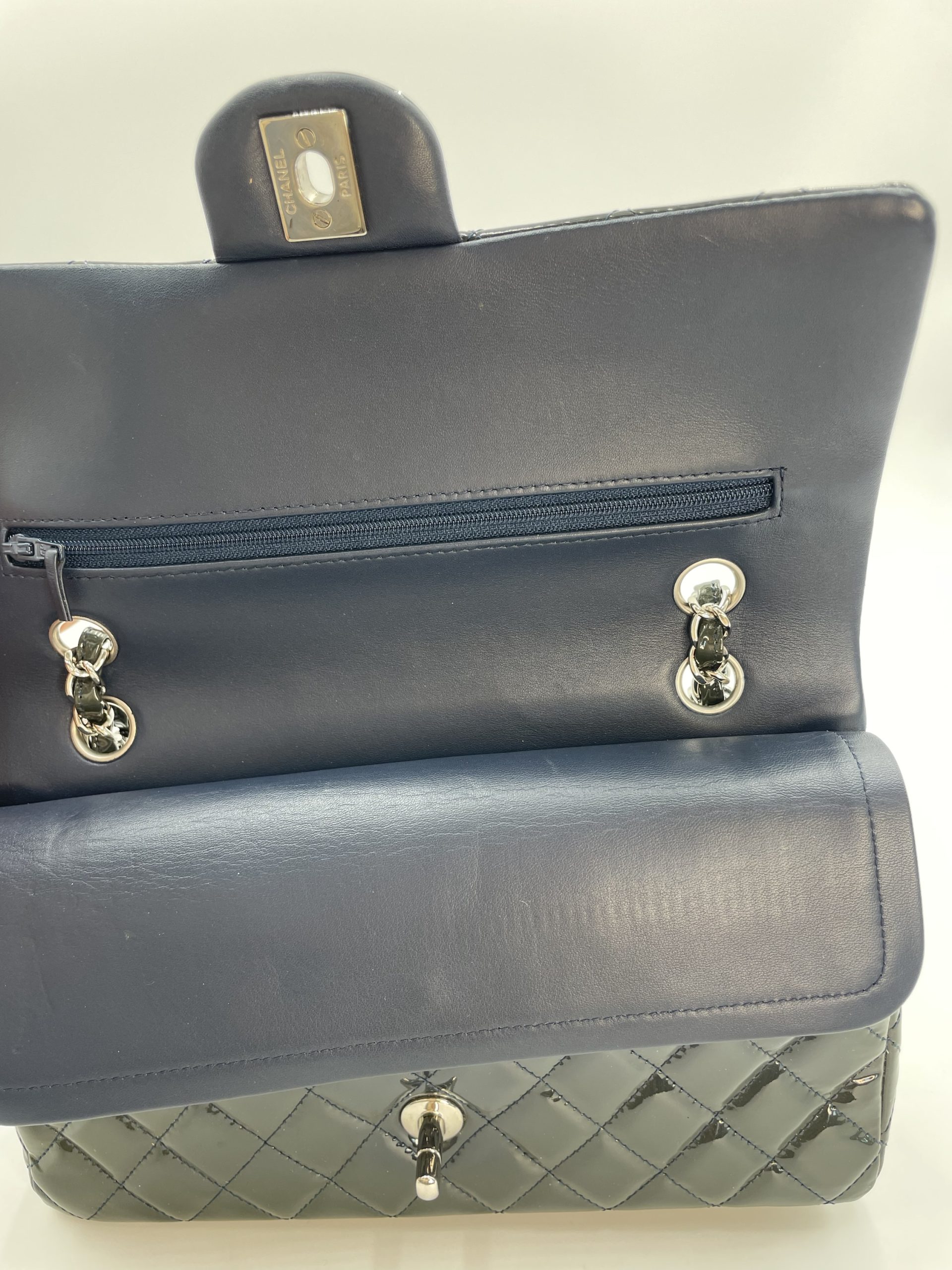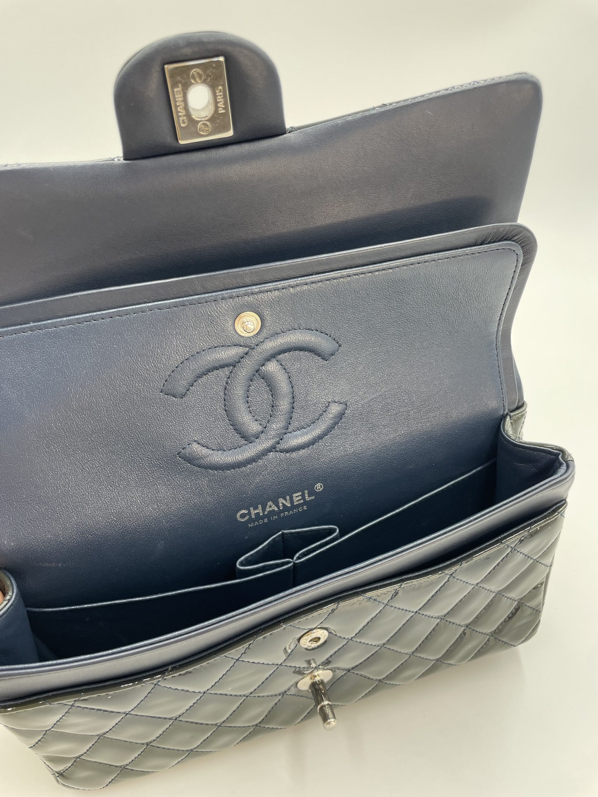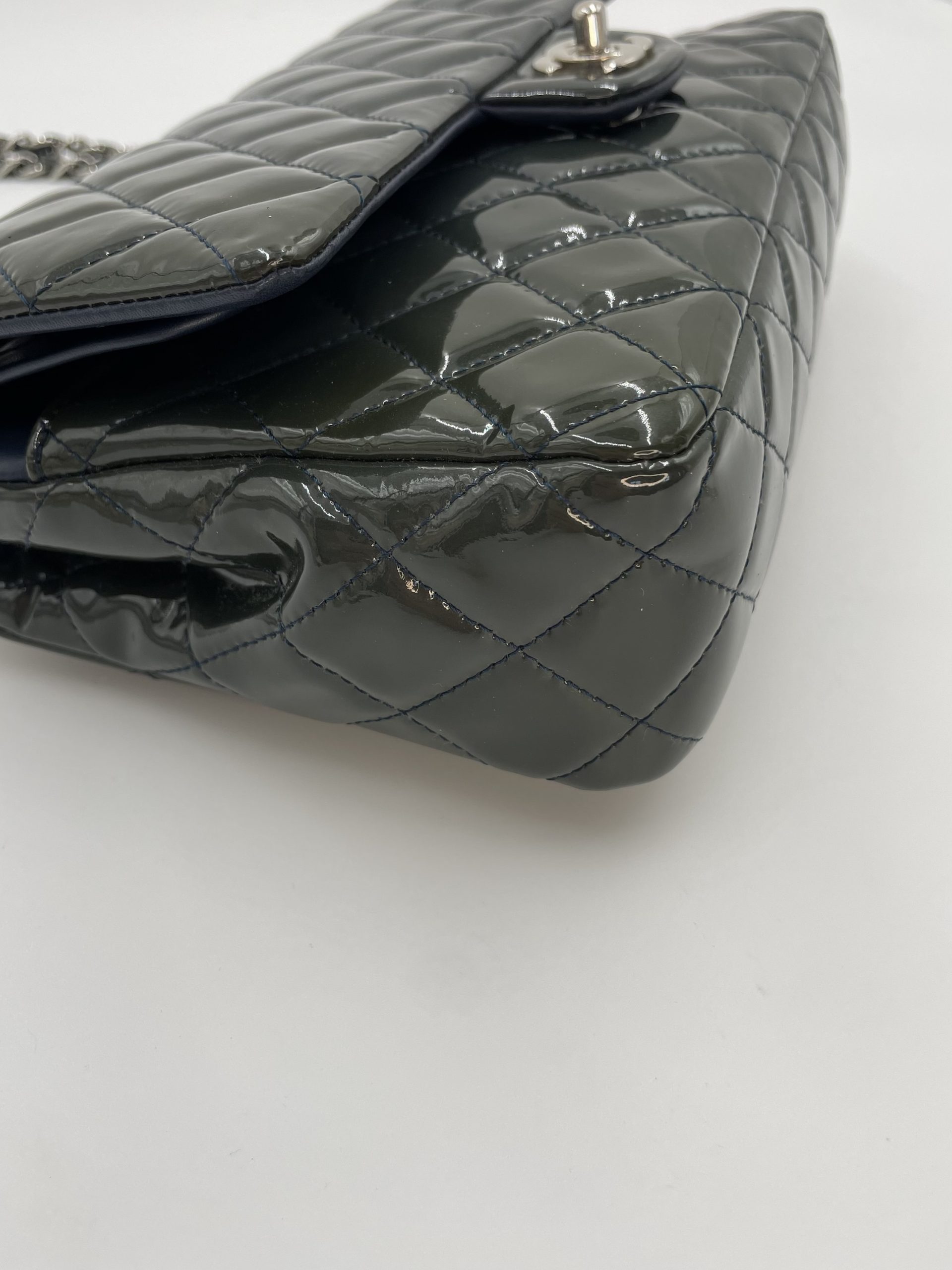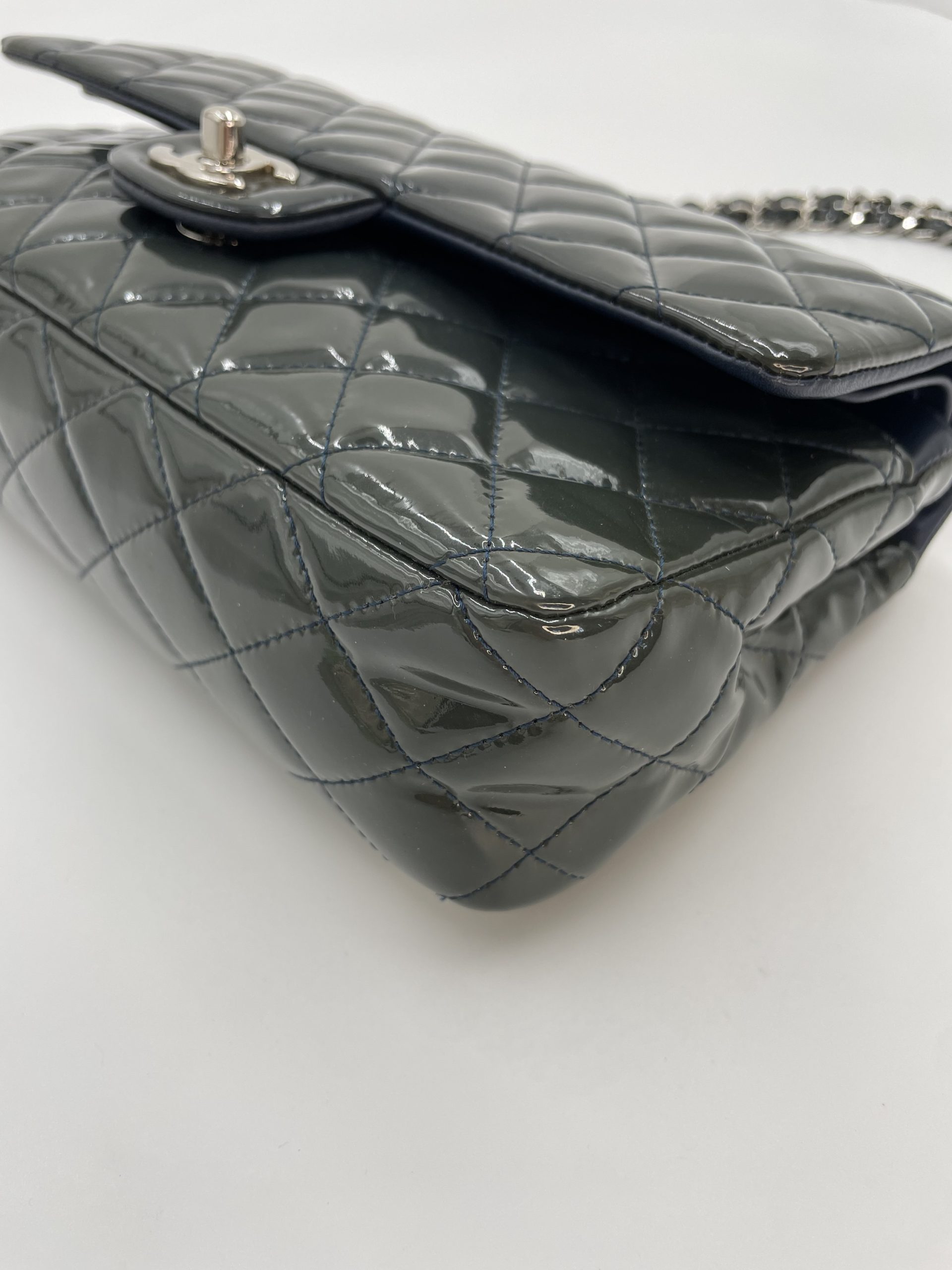 Elegant Chanel Classic Flap i blankt patent leather, der giver tasken et mere edgy og moderne udtryk end den klassiske lambskin. Den glossy overflade reflekterer lyset smukt og fremhæver det ikoniske quiltede design.